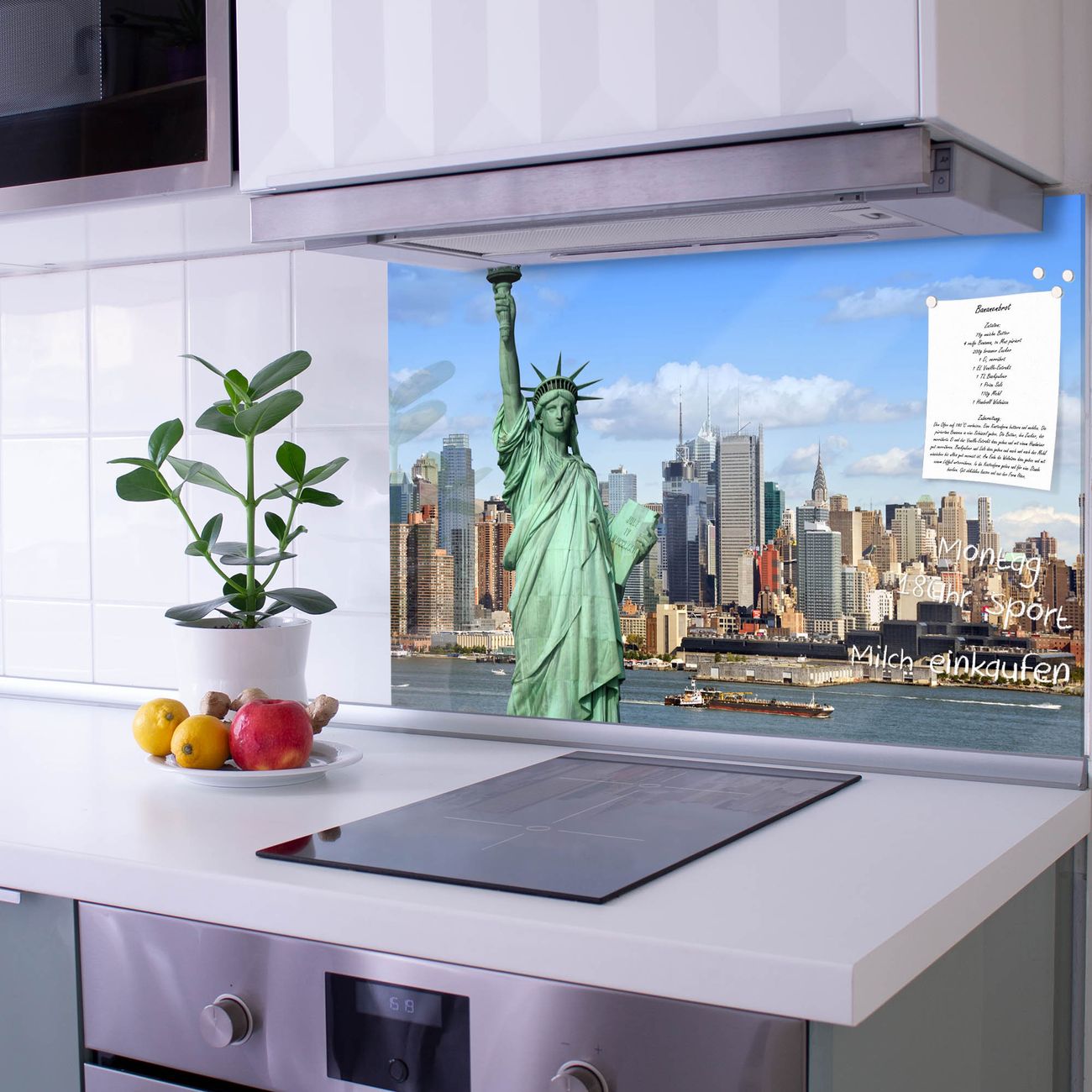 Die Küchenrückwand ist eine elegante Mehrzwecktafel: als Spritzschutz hinter Herd oder Waschbecken, hält Notizen wie ein Memoboard, ist beschreibbar mit Kreidestiften oder Whiteboard-Markern, sieht umwerfend als Glasbild aus. Sie besteht aus gehärtetem Glas, die Rückwand aus einem magnetischen Stahlblech. Durch die superflache Bauweise haben Sie die Wahl aus einer Vielzahl von Befestigungsmöglichkeiten. Sie können die Küchenrückwand mit einem Montagekleber superflach an die Wand kleben oder Sie wählen eines unserer passenden Befestigungssets, welches eine optimale Montage garantiert. Die Küchenrückwand besteht aus zertifiziertem Sicherheitsglas. Durch die mitgelieferten 4 Neodym-Magnete ist Ihre Glas Magnettafel sofort einsatzbereit.
