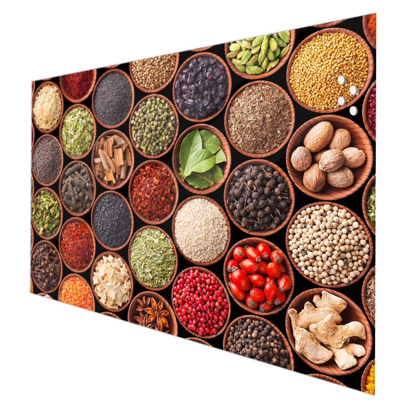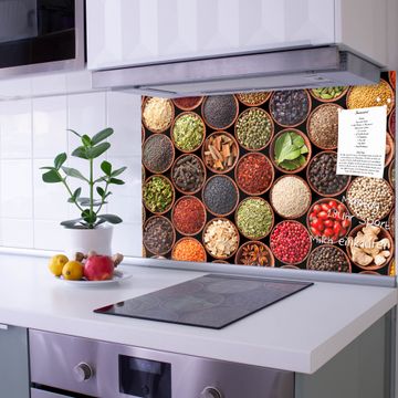 Die banjado Glas Küchenrückwand in verschiedenen Größen mit Motiv Zutaten schützt Ihre Küchenfliesen vor Fettspritzern oder Wasserflecken. Der Spritzschutz ist gleichzeitig magnetisch und hält Ihre Rezepte oder Einkaufslisten. 4 Neodym-Magnete und 1 Kreidestift liegen bereits bei. Leuchtende Motive und hochwertiges Material machen den Spritzschutz zum Designobjekt. Das dekorative Glasbild gibt Ihrer Küche ein individuelles Erscheinungsbild. Abgerundete Kanten und Sicherheitsglas sorgen für einen sicheren Einsatz.