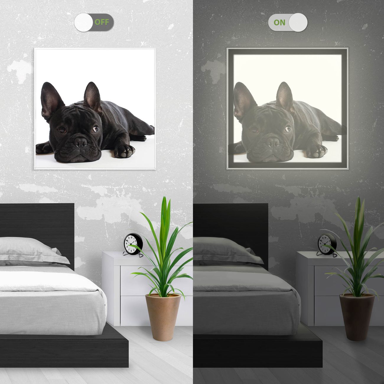 Im eingeschalteten Zustand wirft das Bild einen Schatten wie in der ersten Ansicht zu sehen.