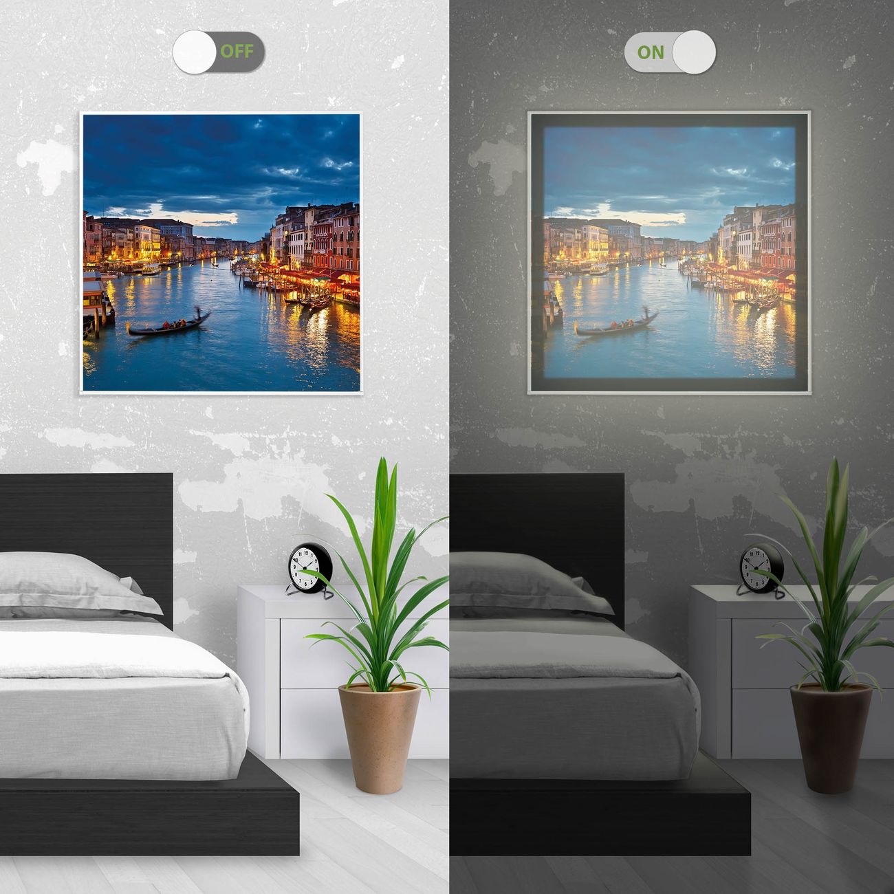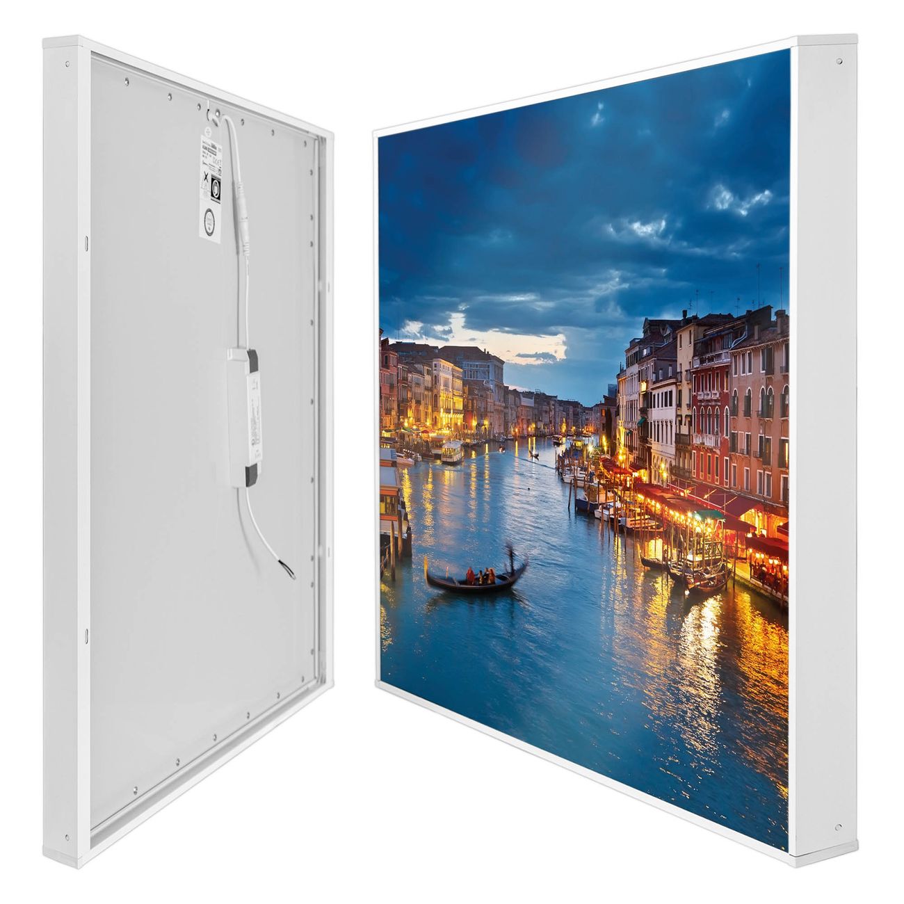 banjado LED Wandleuchte Sie erhalten hier eine stimmungsvolle Lichtquelle bestehend aus dem Set: Smart LED Panel mit Trafo, Motivscheibe (Motiv: Canale Grande Bei Nacht) und Rahmen. Der Aufbau ist denkbar einfach, Sie erhalten eine detaillierte Aufbauanleitung. Die komplette Leuchte kann sowohl an der Wand angeschlossen werden als auch als Deckenleuchte. Die Gesamtgröße der Lampe ist 62,5 x 62,5 x 4,5cm (HxBxT). Das Set besteht aus: LED Panel mit Trafo, Rahmen und Motivbild zum Selbstaufbau.