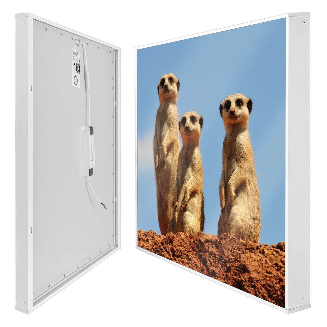 banjado LED Wandleuchte Sie erhalten hier eine stimmungsvolle Lichtquelle bestehend aus dem Set: Smart LED Panel mit Trafo, Motivscheibe (Motiv: Erdmännchenfamilie) und Rahmen. Der Aufbau ist denkbar einfach, Sie erhalten eine detaillierte Aufbauanleitung. Die komplette Leuchte kann sowohl an der Wand angeschlossen werden als auch als Deckenleuchte. Die Gesamtgröße der Lampe ist 62,5 x 62,5 x 4,5cm (HxBxT). Das Set besteht aus: LED Panel mit Trafo, Rahmen und Motivbild zum Selbstaufbau.
