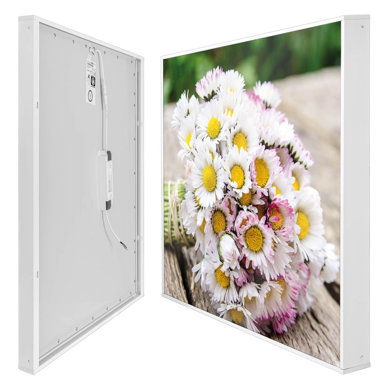 banjado LED Wandleuchte Sie erhalten hier eine stimmungsvolle Lichtquelle bestehend aus dem Set: Smart LED Panel mit Trafo, Motivscheibe (Motiv: Strauß Gänseblümchen) und Rahmen. Der Aufbau ist denkbar einfach, Sie erhalten eine detaillierte Aufbauanleitung. Die komplette Leuchte kann sowohl an der Wand angeschlossen werden als auch als Deckenleuchte. Die Gesamtgröße der Lampe ist 62,5 x 62,5 x 4,5cm (HxBxT). Das Set besteht aus: LED Panel mit Trafo, Rahmen und Motivbild zum Selbstaufbau.