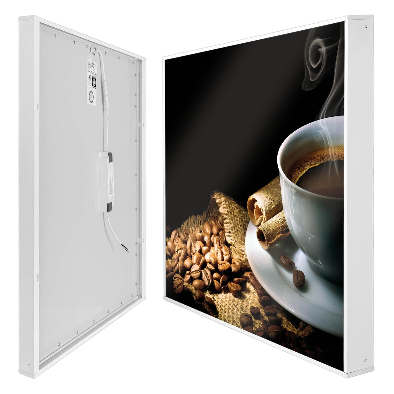 banjado LED Wandleuchte Sie erhalten hier eine stimmungsvolle Lichtquelle bestehend aus dem Set: Smart LED Panel mit Trafo, Motivscheibe (Motiv: Hot Coffee) und Rahmen. Der Aufbau ist denkbar einfach, Sie erhalten eine detaillierte Aufbauanleitung. Die komplette Leuchte kann sowohl an der Wand angeschlossen werden als auch als Deckenleuchte. Die Gesamtgröße der Lampe ist 62,5 x 62,5 x 4,5cm (HxBxT). Das Set besteht aus: LED Panel mit Trafo, Rahmen und Motivbild zum Selbstaufbau.