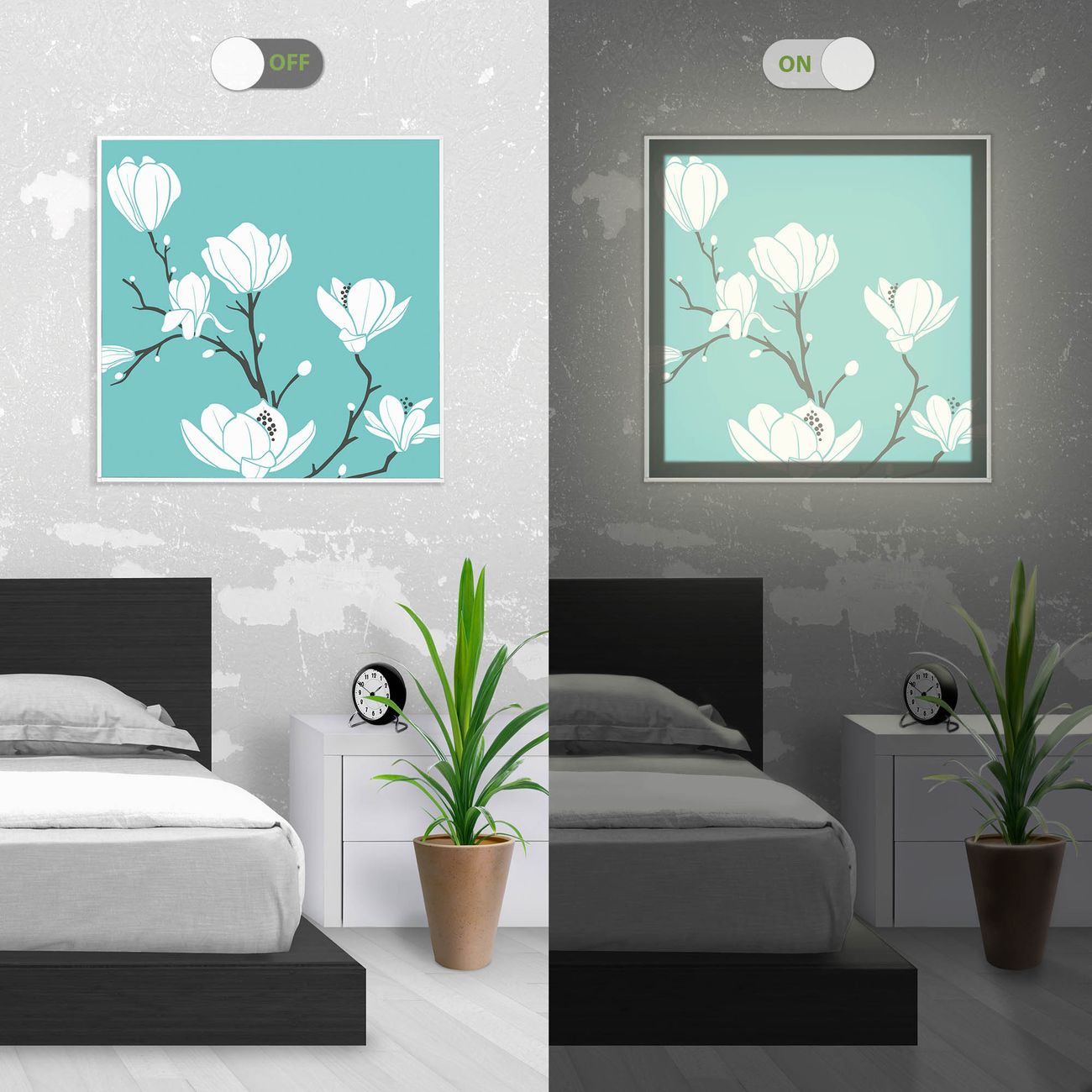 Im eingeschalteten Zustand wirft das Bild einen Schatten wie in der ersten Ansicht zu sehen.