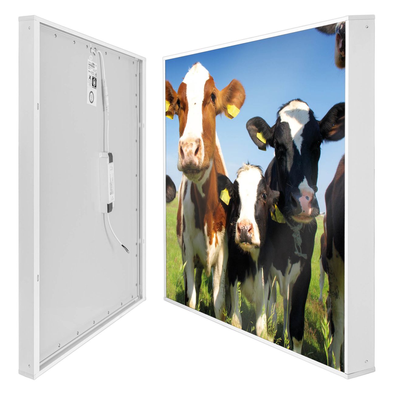 banjado LED Wandleuchte Sie erhalten hier eine stimmungsvolle Lichtquelle bestehend aus dem Set: Smart LED Panel mit Trafo, Motivscheibe (Motiv: Kühe) und Rahmen. Der Aufbau ist denkbar einfach, Sie erhalten eine detaillierte Aufbauanleitung. Die komplette Leuchte kann sowohl an der Wand angeschlossen werden als auch als Deckenleuchte. Die Gesamtgröße der Lampe ist 62,5 x 62,5 x 4,5cm (HxBxT). Das Set besteht aus: LED Panel mit Trafo, Rahmen und Motivbild zum Selbstaufbau.