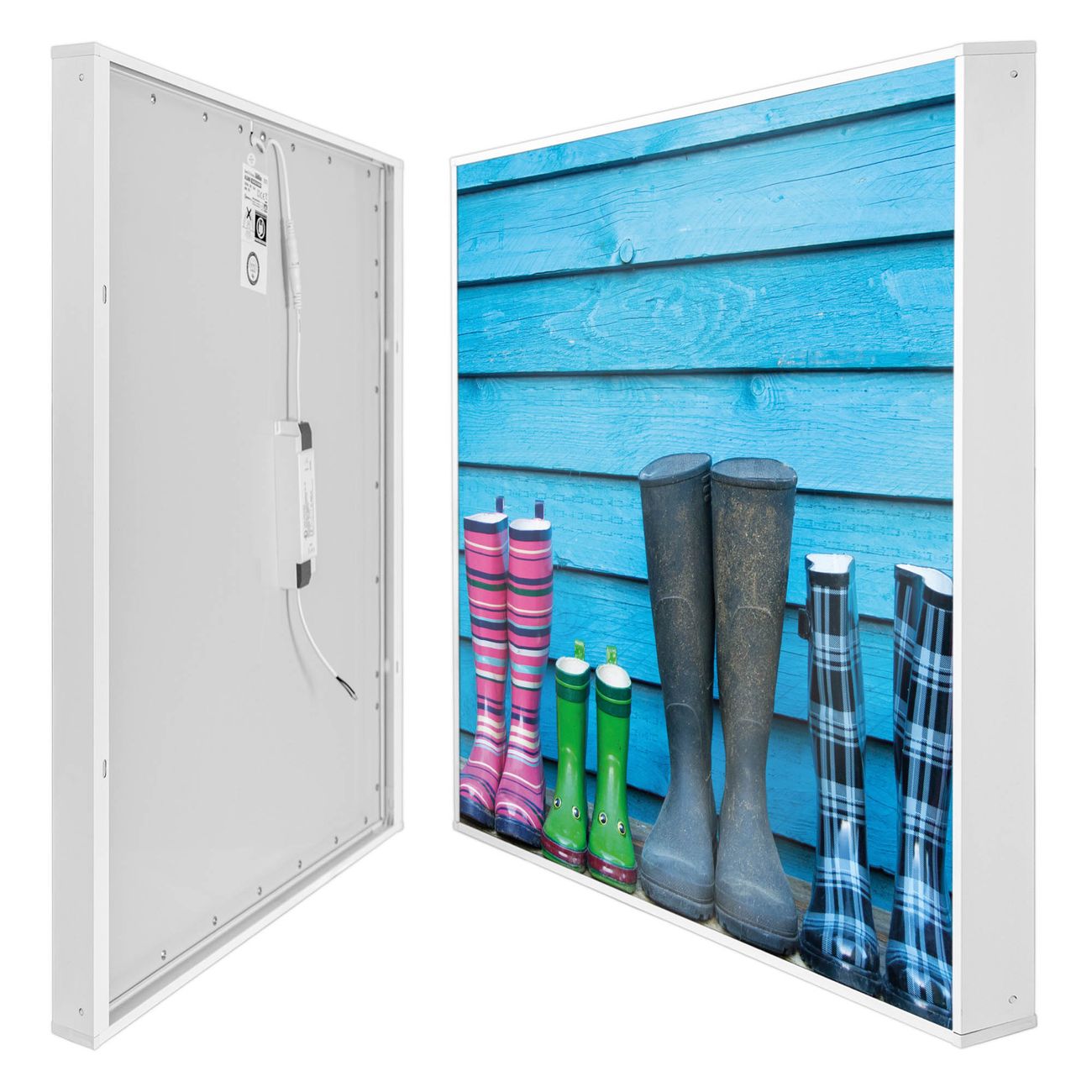 banjado LED Wandleuchte Sie erhalten hier eine stimmungsvolle Lichtquelle bestehend aus dem Set: Smart LED Panel mit Trafo, Motivscheibe (Motiv: Gummistiefel) und Rahmen. Der Aufbau ist denkbar einfach, Sie erhalten eine detaillierte Aufbauanleitung. Die komplette Leuchte kann sowohl an der Wand angeschlossen werden als auch als Deckenleuchte. Die Gesamtgröße der Lampe ist 62,5 x 62,5 x 4,5cm (HxBxT). Das Set besteht aus: LED Panel mit Trafo, Rahmen und Motivbild zum Selbstaufbau.