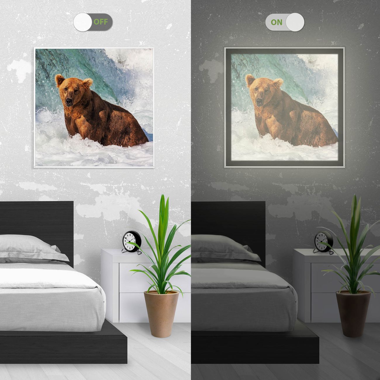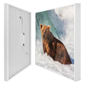 Mit der banjado smarten LED Wandleuchte mit Motiv Bär Im Wasser schaffen Sie in Ihren Räumen eine besondere Atmosphäre. Abends spendet die Wandlampe Licht und tagsüber haben Sie ein stimmungsvolles Wandbild. Die Leuchte besteht aus einem zeitlosen weißen Rahmen, in den das smarte WLAN LED Paneel sowie das Bild eingefasst wird. Die Montage ist denkbar einfach, Sie erhalten eine detaillierte Aufbauanleitung sowie Montagematerial. Eine angenehme Lichtquelle erhöht nachweislich das Wohlbefinden. Das Motiv der Leuchte lässt sich leicht wechseln, so können Sie Ihre Wohnräume individuell gestalten. Die Montage ist an der Wand oder an der Decke möglich.
