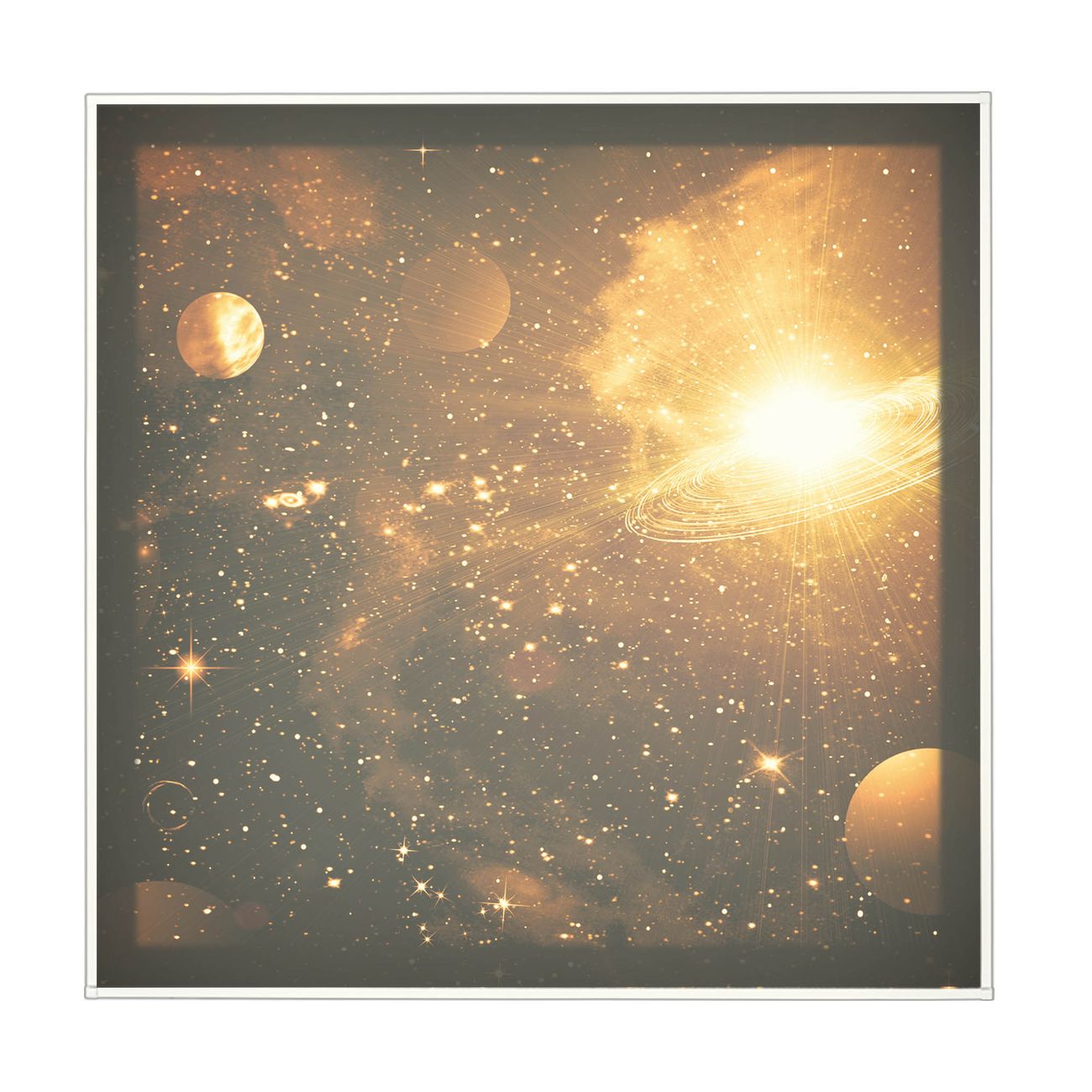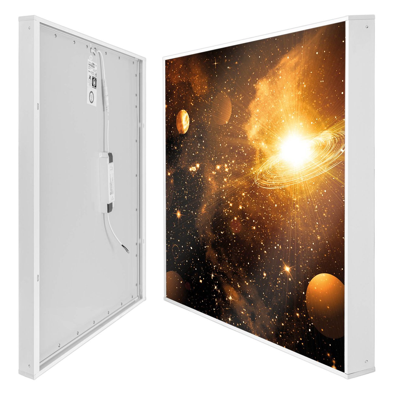 banjado LED Wandleuchte Sie erhalten hier eine stimmungsvolle Lichtquelle bestehend aus dem Set: Smart LED Panel mit Trafo, Motivscheibe (Motiv: Outer Space) und Rahmen. Der Aufbau ist denkbar einfach, Sie erhalten eine detaillierte Aufbauanleitung. Die komplette Leuchte kann sowohl an der Wand angeschlossen werden als auch als Deckenleuchte. Die Gesamtgröße der Lampe ist 62,5 x 62,5 x 4,5cm (HxBxT). Das Set besteht aus: LED Panel mit Trafo, Rahmen und Motivbild zum Selbstaufbau.