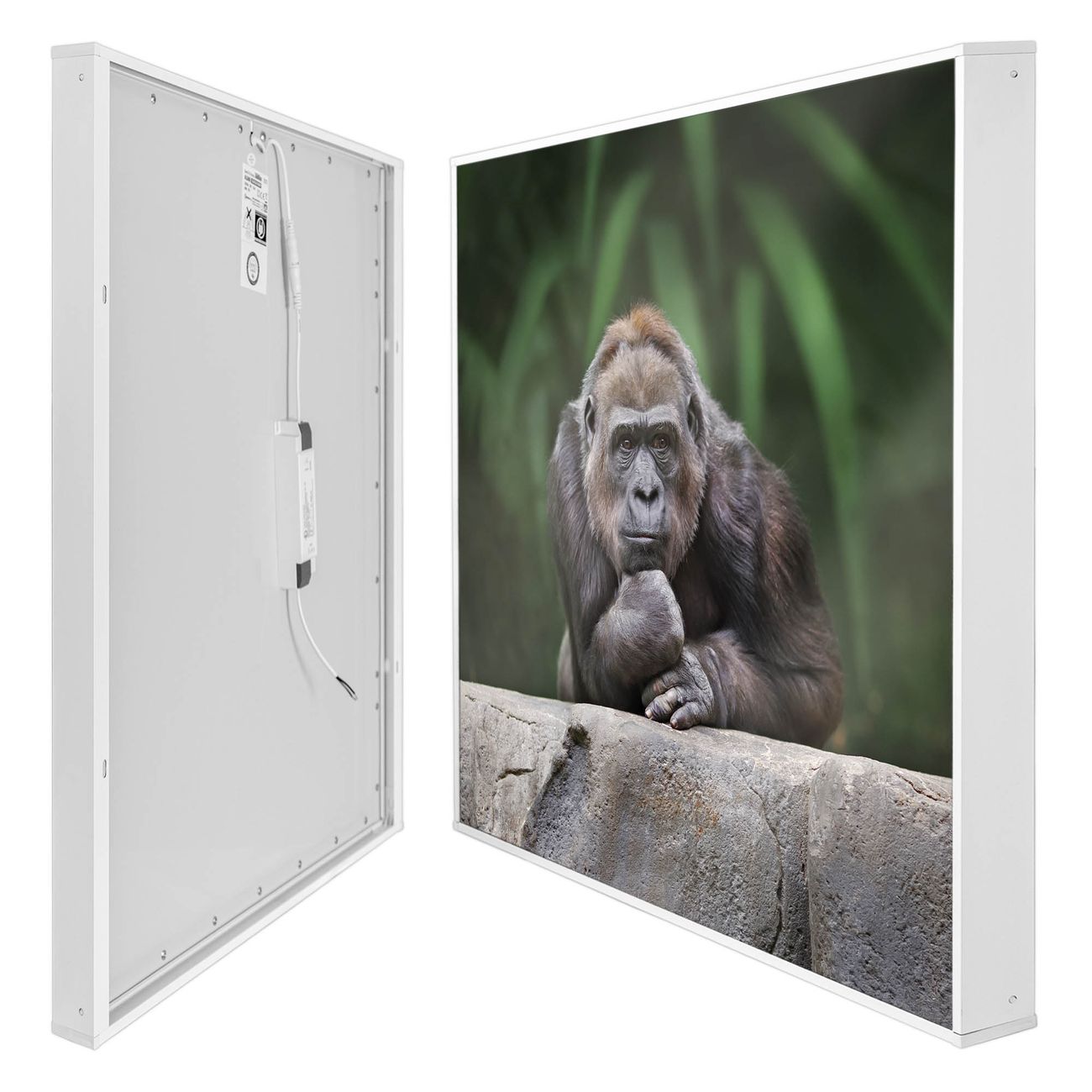 banjado LED Wandleuchte Sie erhalten hier eine stimmungsvolle Lichtquelle bestehend aus dem Set: Smart LED Panel mit Trafo, Motivscheibe (Motiv: Gorilla) und Rahmen. Der Aufbau ist denkbar einfach, Sie erhalten eine detaillierte Aufbauanleitung. Die komplette Leuchte kann sowohl an der Wand angeschlossen werden als auch als Deckenleuchte. Die Gesamtgröße der Lampe ist 62,5 x 62,5 x 4,5cm (HxBxT). Das Set besteht aus: LED Panel mit Trafo, Rahmen und Motivbild zum Selbstaufbau.