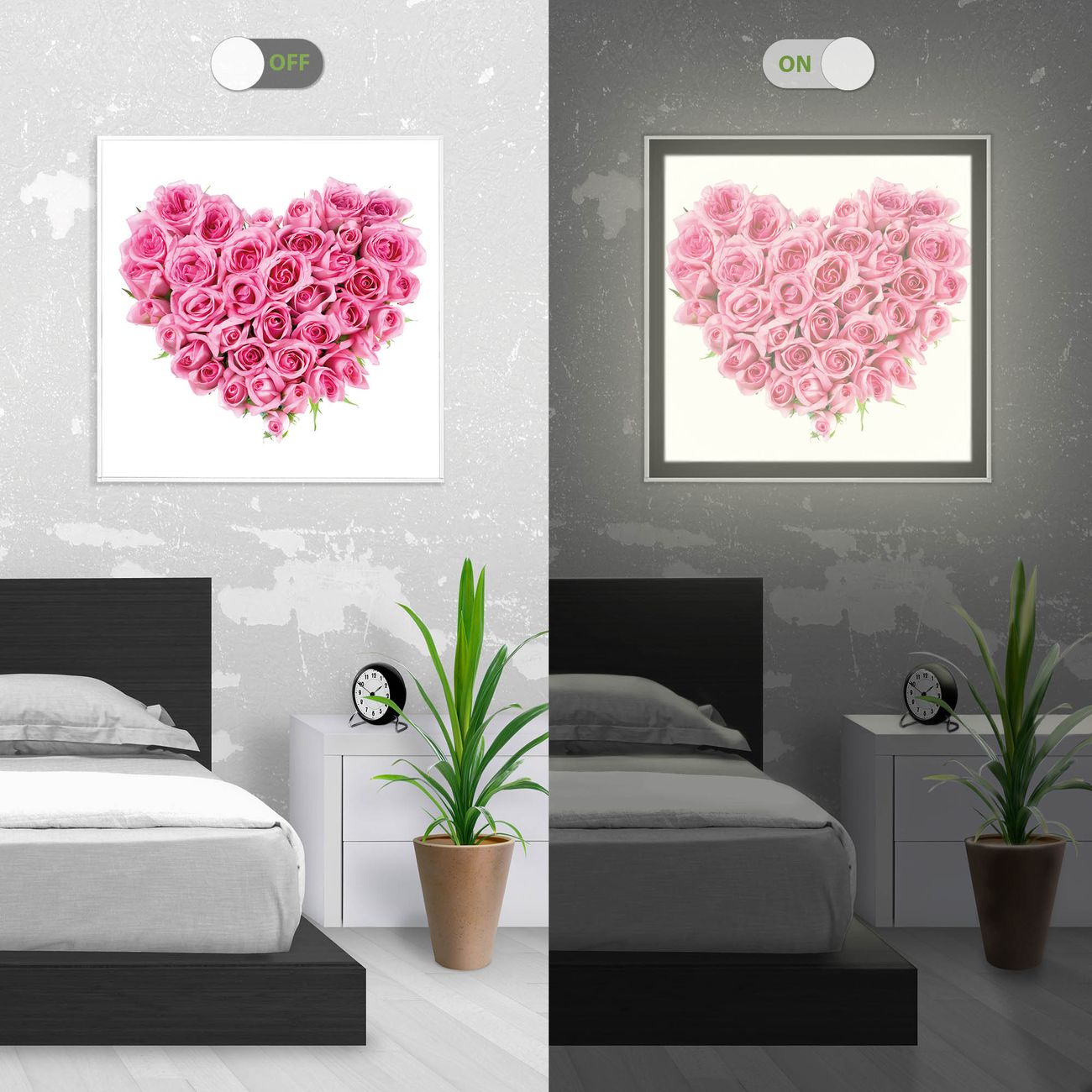 Im eingeschalteten Zustand wirft das Bild einen Schatten wie in der ersten Ansicht zu sehen.