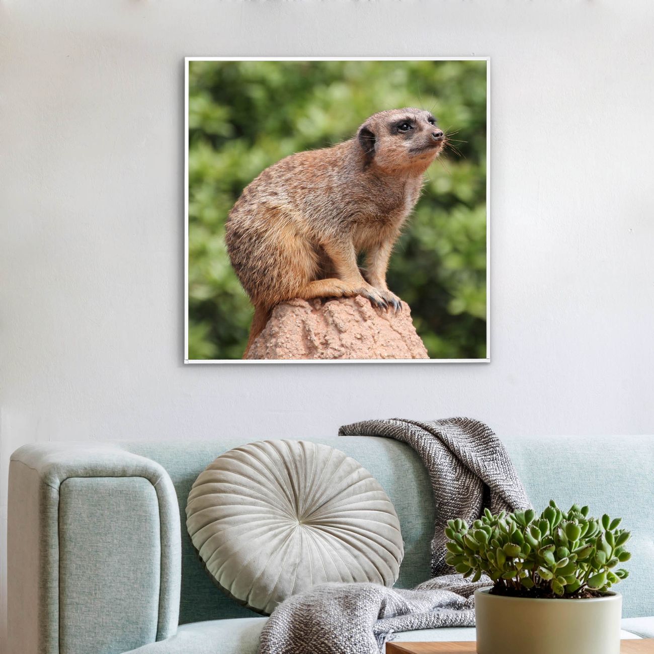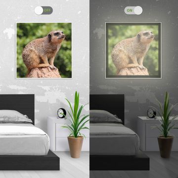 Mit der banjado smarten LED Wandleuchte mit Motiv Sitzendes Erdmännchen schaffen Sie in Ihren Räumen eine besondere Atmosphäre. Abends spendet die Wandlampe Licht und tagsüber haben Sie ein stimmungsvolles Wandbild. Die Leuchte besteht aus einem zeitlosen weißen Rahmen, in den das smarte WLAN LED Paneel sowie das Bild eingefasst wird. Die Montage ist denkbar einfach, Sie erhalten eine detaillierte Aufbauanleitung sowie Montagematerial. Eine angenehme Lichtquelle erhöht nachweislich das Wohlbefinden. Das Motiv der Leuchte lässt sich leicht wechseln, so können Sie Ihre Wohnräume individuell gestalten. Die Montage ist an der Wand oder an der Decke möglich.
