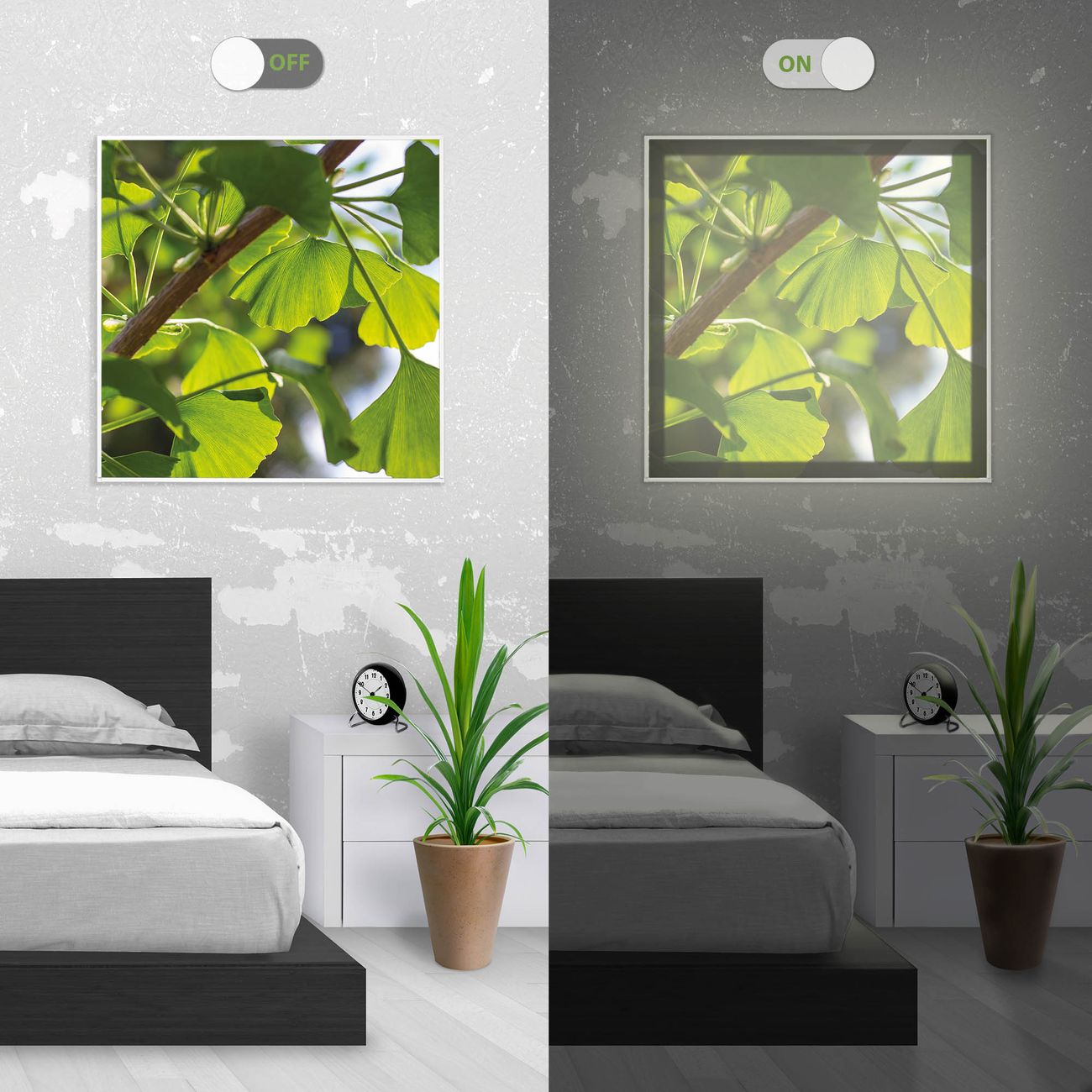 Im eingeschalteten Zustand wirft das Bild einen Schatten wie in der ersten Ansicht zu sehen.