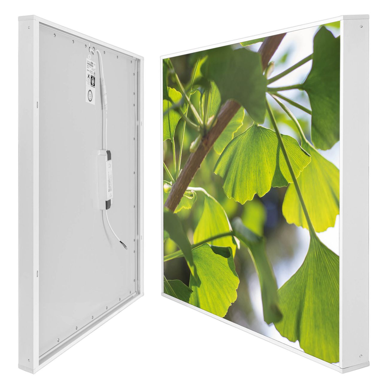 banjado LED Wandleuchte Sie erhalten hier eine stimmungsvolle Lichtquelle bestehend aus dem Set: Smart LED Panel mit Trafo, Motivscheibe (Motiv: Gingko) und Rahmen. Der Aufbau ist denkbar einfach, Sie erhalten eine detaillierte Aufbauanleitung. Die komplette Leuchte kann sowohl an der Wand angeschlossen werden als auch als Deckenleuchte. Die Gesamtgröße der Lampe ist 62,5 x 62,5 x 4,5cm (HxBxT). Das Set besteht aus: LED Panel mit Trafo, Rahmen und Motivbild zum Selbstaufbau.