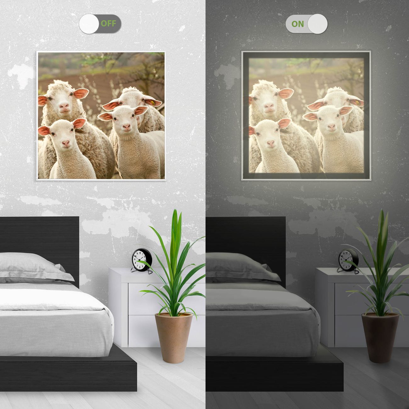 Mit der banjado smarten LED Wandleuchte mit Motiv Schaffamilie schaffen Sie in Ihren Räumen eine besondere Atmosphäre. Abends spendet die Wandlampe Licht und tagsüber haben Sie ein stimmungsvolles Wandbild. Die Leuchte besteht aus einem zeitlosen weißen Rahmen, in den das smarte WLAN LED Paneel sowie das Bild eingefasst wird. Die Montage ist denkbar einfach, Sie erhalten eine detaillierte Aufbauanleitung sowie Montagematerial. Eine angenehme Lichtquelle erhöht nachweislich das Wohlbefinden. Das Motiv der Leuchte lässt sich leicht wechseln, so können Sie Ihre Wohnräume individuell gestalten. Die Montage ist an der Wand oder an der Decke möglich.