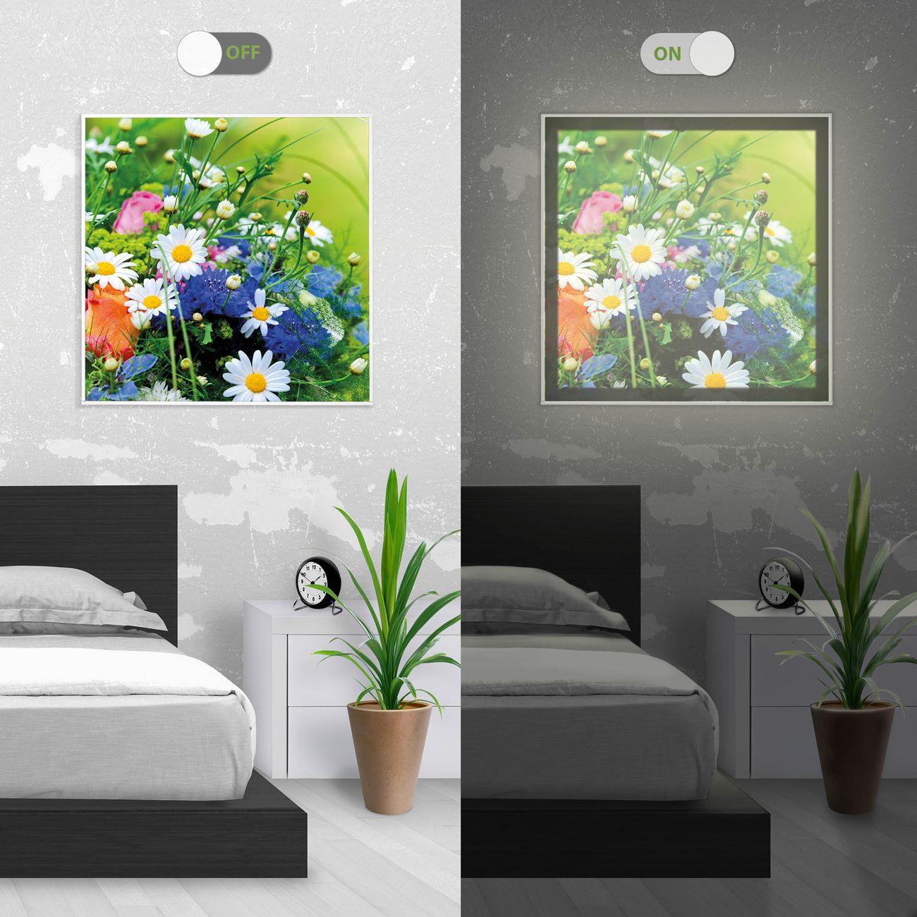 Im eingeschalteten Zustand wirft das Bild einen Schatten wie in der ersten Ansicht zu sehen.