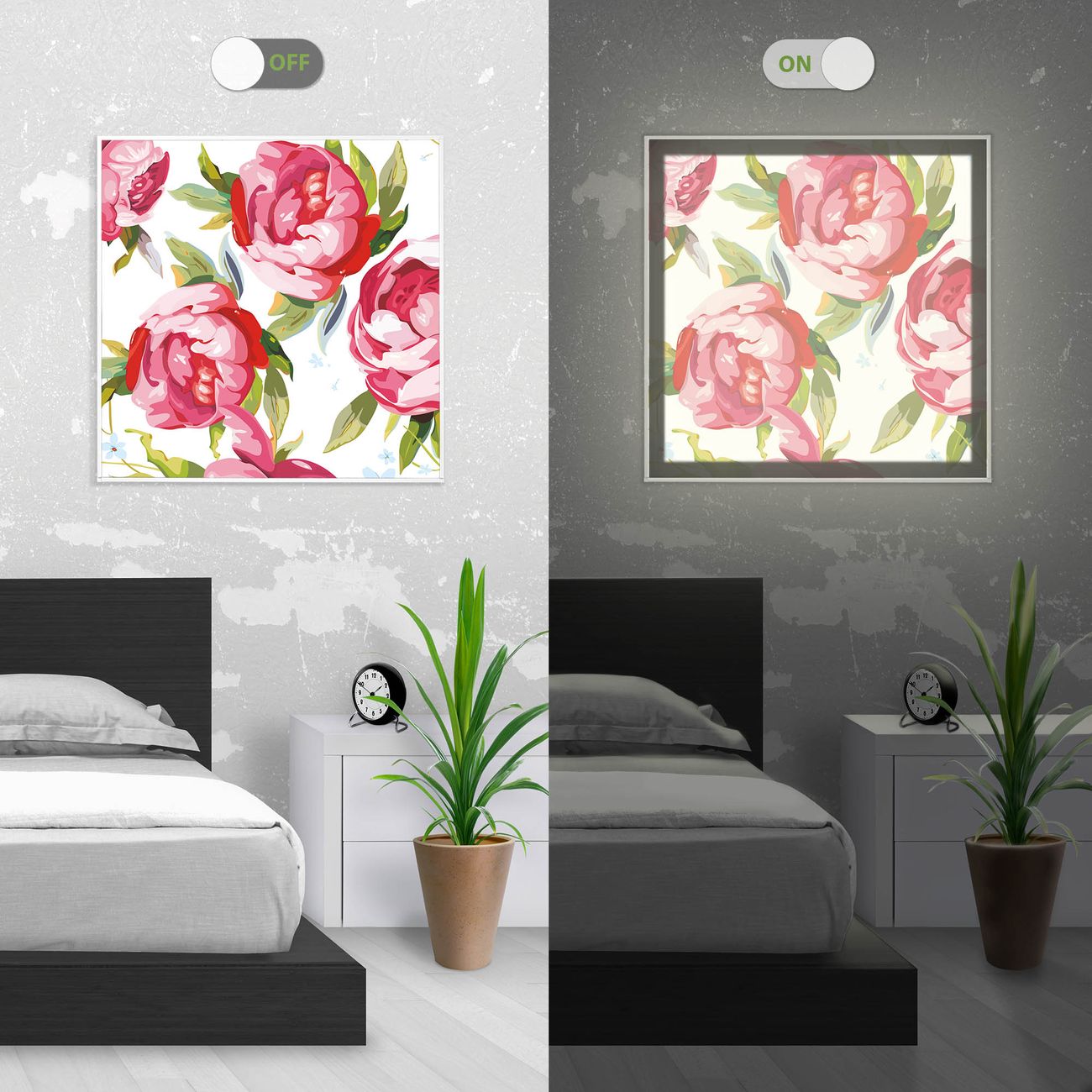 Im eingeschalteten Zustand wirft das Bild einen Schatten wie in der ersten Ansicht zu sehen.