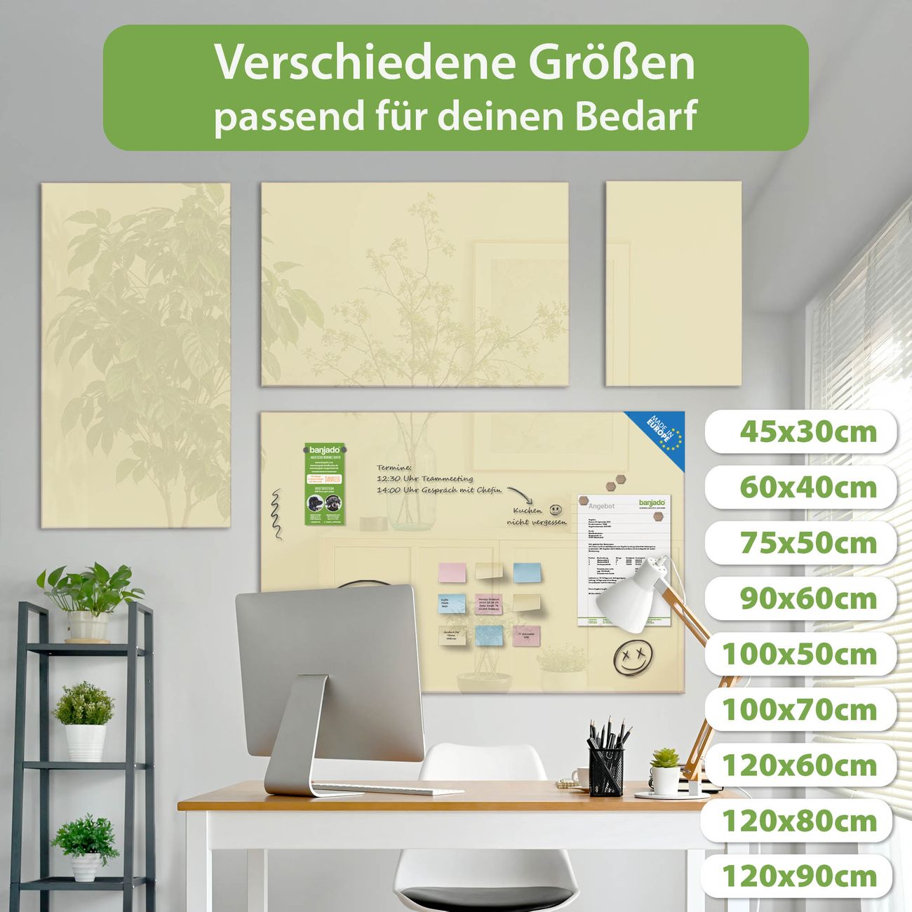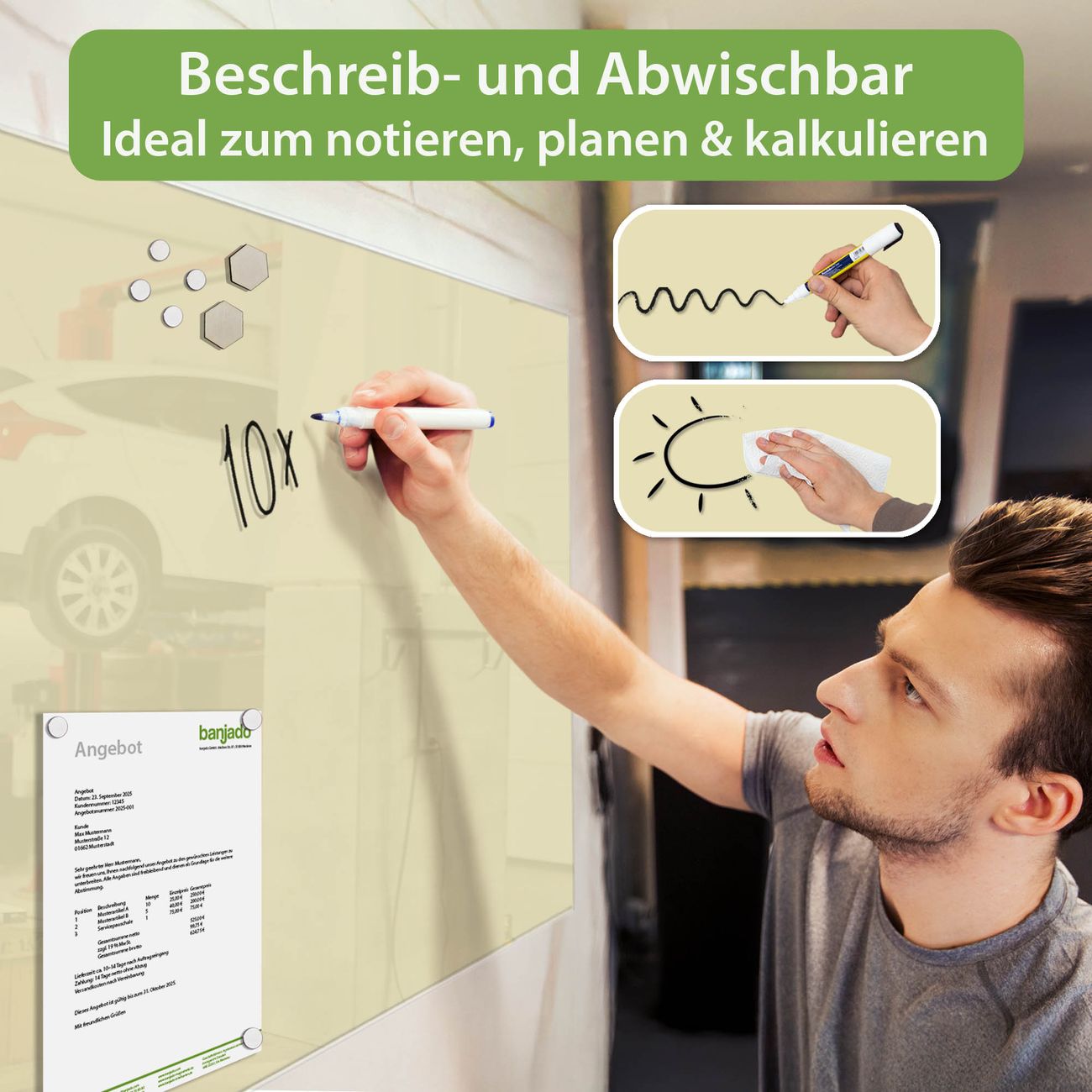 Jede Glas Magnettafel wird in unserer Werkstatt von Hand gefertigt und sorgfältig geprüft. So erhalten Sie ein echtes Qualitätsprodukt, das Funktion und Ästhetik perfekt vereint.?? Warum banjado?