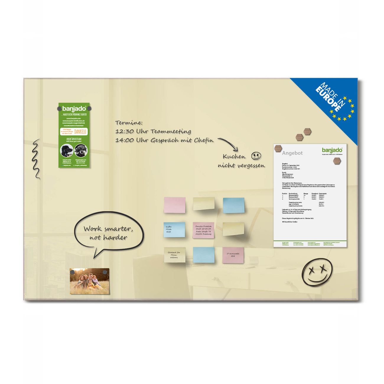Jede Glas Magnettafel wird in unserer Werkstatt von Hand gefertigt und sorgfältig geprüft. So erhalten Sie ein echtes Qualitätsprodukt, das Funktion und Ästhetik perfekt vereint.?? Warum banjado?