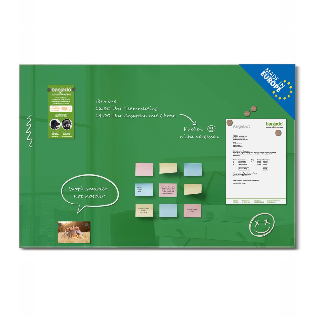 Jede Glas Magnettafel wird in unserer Werkstatt von Hand gefertigt und sorgfältig geprüft. So erhalten Sie ein echtes Qualitätsprodukt, das Funktion und Ästhetik perfekt vereint.?? Warum banjado?