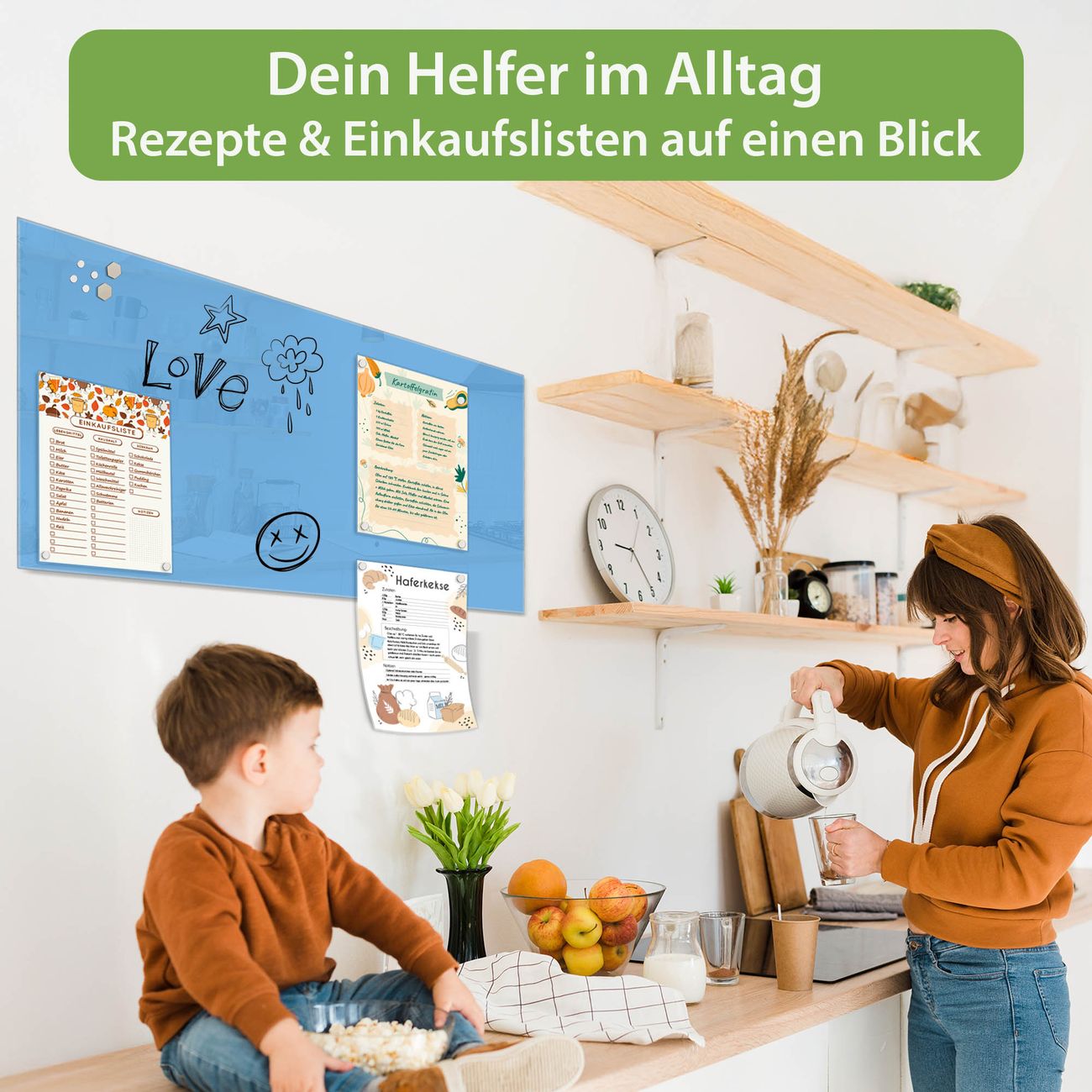 Ein Stück Design, das Ihren Alltag organisiert. Schreiben, heften, inspirieren - alles an einem Ort. Qualität, die man spürt. Montage leicht gemacht. Handwerk mit Herz - veredelt in Sachsen. Einzigartiges Design mit Motiv Farbe Pastellblau Beschreibbare Glasoberfläche, leicht zu reinigen Starke Magnetkraft durch Stahlrückwand Inklusive 4 Neodym-Magneten Flexible Montageoptionen Handveredelt in Sachsen - Qualität, die bleibt