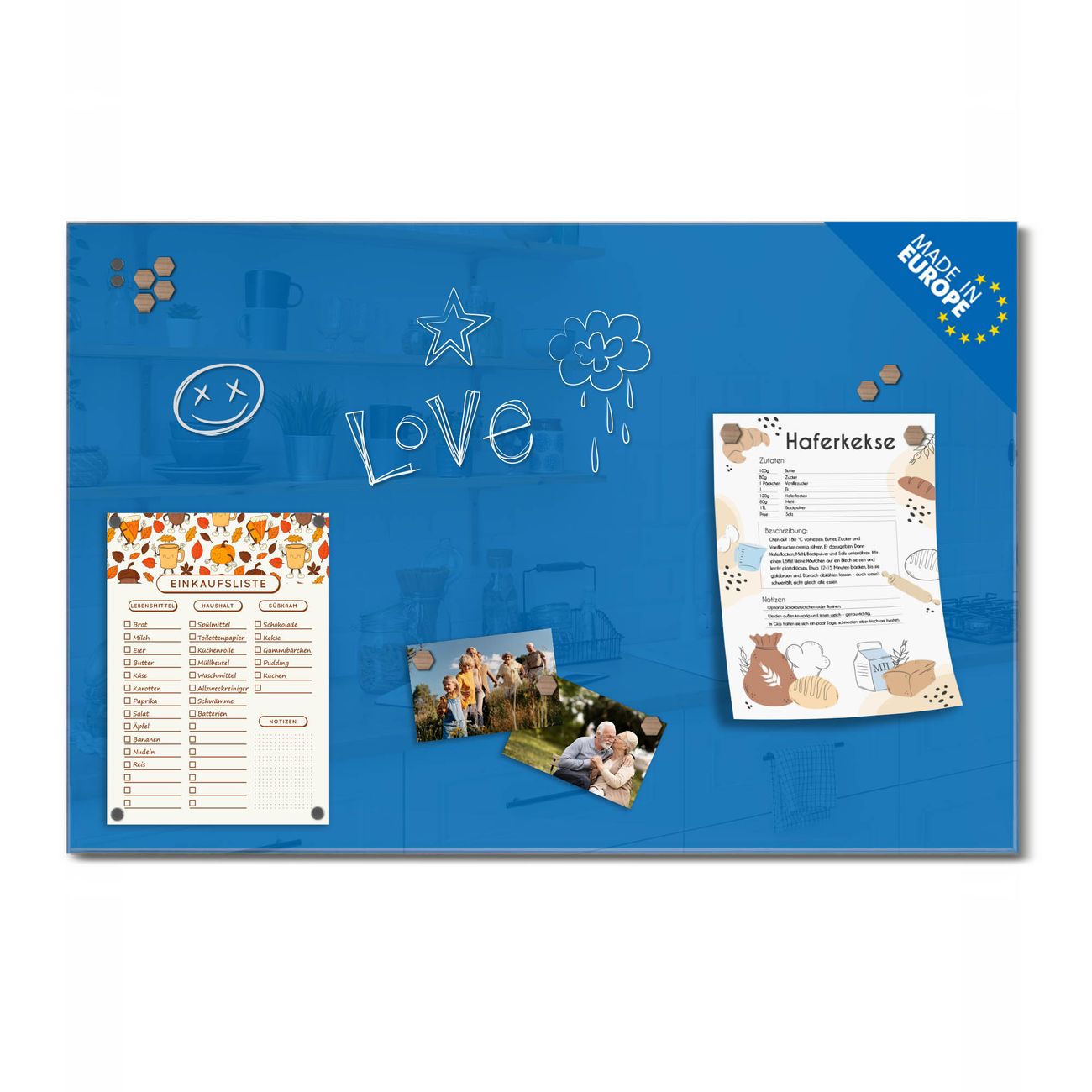 Ein Stück Design, das Ihren Alltag organisiert. Schreiben, heften, inspirieren - alles an einem Ort. Qualität, die man spürt. Montage leicht gemacht. Handwerk mit Herz - veredelt in Sachsen. Einzigartiges Design mit Motiv Farbe Signalblau Beschreibbare Glasoberfläche, leicht zu reinigen Starke Magnetkraft durch Stahlrückwand Inklusive 4 Neodym-Magneten Flexible Montageoptionen Handveredelt in Sachsen - Qualität, die bleibt