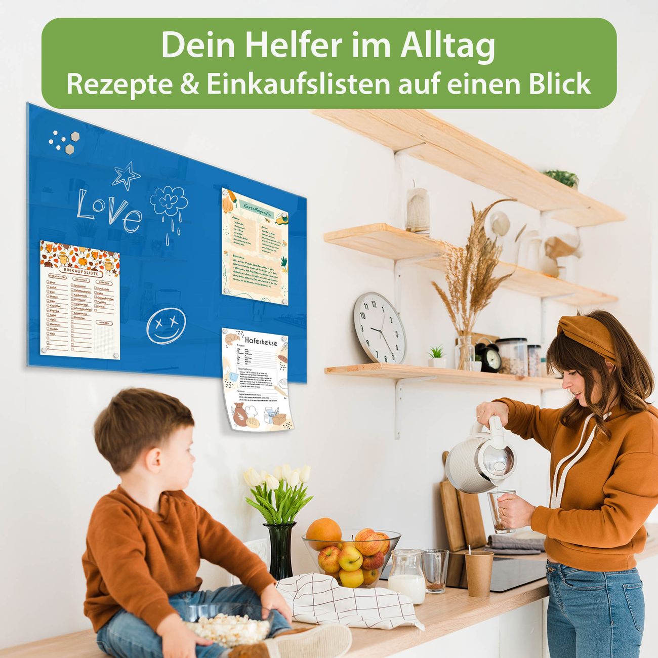 Auf der glatten Glasoberfläche lassen sich Termine, Rezepte oder Notizen ganz einfach mit Kreidestiften festhalten und rückstandslos entfernen. Starke Neodym-Magnete halten Ihre wichtigsten Erinnerungen sicher an Ort und Stelle. So entsteht Ihre ganz persönliche Ideenwand - jeden Tag neu.