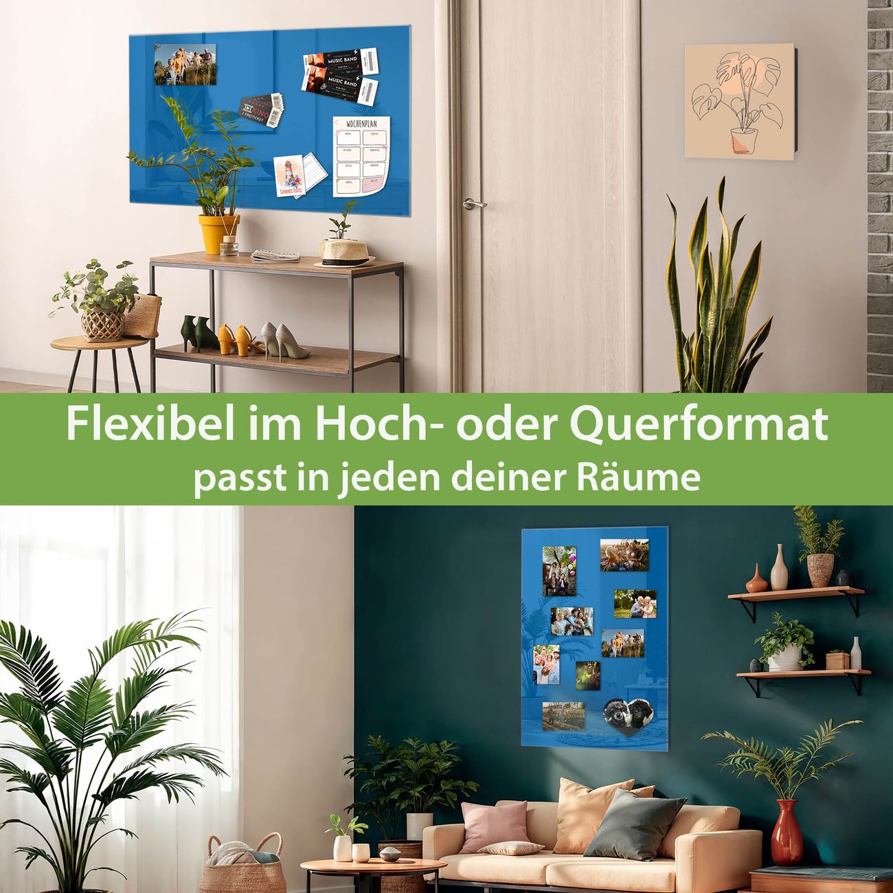 Dank der flachen Bauweise wirkt die Magnetwand fast schwebend an der Wand. Sie können sie mit Montagekleber elegant befestigen oder mit einem passenden Set klassisch verschrauben - beides sorgt für sicheren Halt und eine dezente Optik.