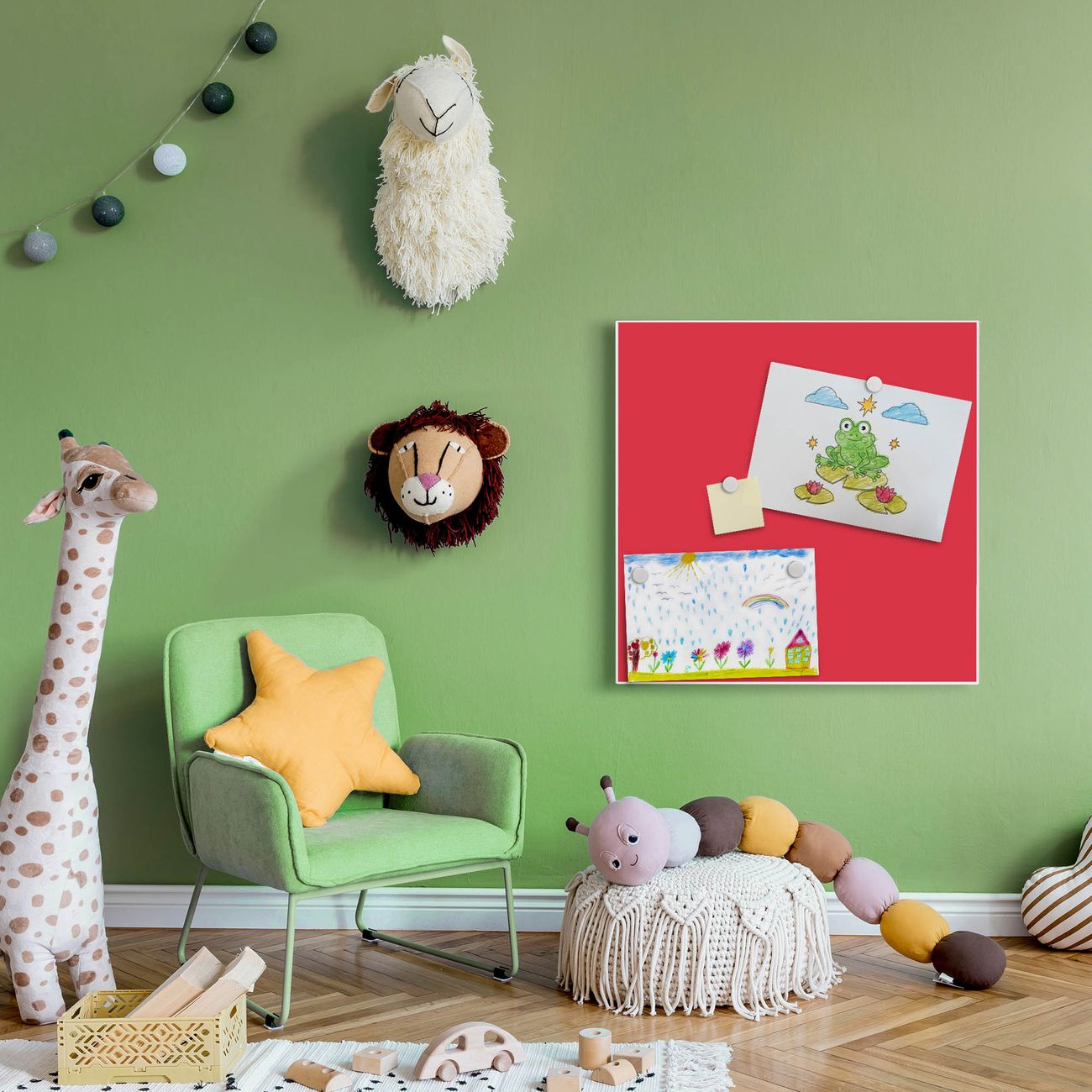 Die banjado Design Magnettafel mit Motiv Farbe Feuerrot bringt Ordnung in Ihr Zettelchaos. Fotos, Termine, Notizen oder Rezepte lassen Sich hier stilvoll mit Magneten ordnen, Sie behalten alles im Blick. An der Pinnwand halten alle handelsüblichen Magnete. Mit dieser Pinnwand aus Metall haben Sie auch ohne Notizen und Magnete ein schönes Dekoelement. Das Quadratische Format bietet Ihnen ausreichend Platz um alle wichtigen Informationen im Blick zu behalten.