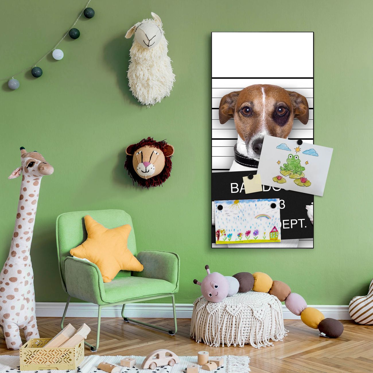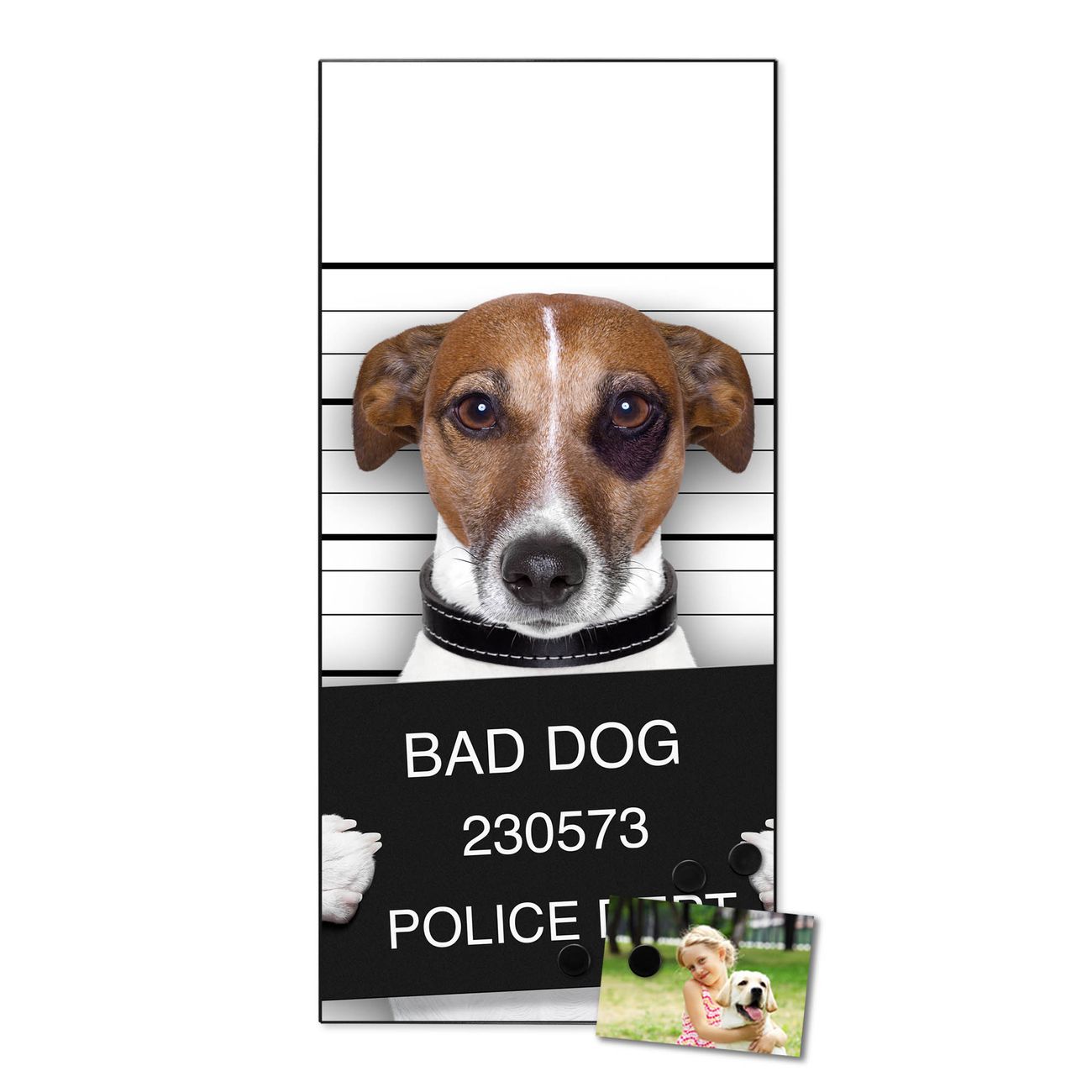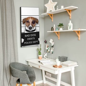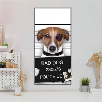 FUNKTION:  Die banjado Magnettafel mit Motiv Bad Dog Jack Russel Motiv bringt Ordnung in Ihr Zettelchaos. Fotos, Termine, Notizen oder Rezepte lassen Sich hier stilvoll mit Magneten ordnen, Sie behalten alles im Blick. An der Design Magnettafel halten alle handesüblichen Magnete. DESIGN:  Die magnetische Pinnwand mit dem Motiv Motiv Bad Dog Jack Russel ist ein eleganter Begleiter im Alltag. Mit dieser Memotafel aus Metall haben Sie auch ohne Notizen und Magnete ein schönes Dekoelement. Das Format bietet Ihnen ausreichend Platz um alle wichtigen Informationen im Blick zu behalten. DETAILS:  Die Magnettafel besteht aus silber-grau, weiß oder schwarzlackiertem Stahl. Sie hat eine Größe von 37 x 78 x 2cm. Es befinden sich auf der Rückseite vorgefertigte Aufhängungen die eine schnelle und unkomplizierte Anbringung ermöglichen. Das Motiv ist mit einem seidenmatten Laminat versehen und schützt so zusätzlich vor Kratzern. NUTZEN:  Sie können dieses Memoboard groß als Wandbild nutzen, es halten alle handelsüblichen Magneten daran. Die Pinnwand ist mit einem feuchten Lappen oder Schwamm abwischbar. Sie finden bei uns eine große Auswahl an passenden Magneten. BANJADO:  Wir sind ein kleines Team aus dem Herzen von Sachsen. Wir fertigen alle Artikel von Hand für Sie an, Sie erhalten keine preiswerte Importware. Auf Wunsch können Sie auch Ihr eigenes Foto auf die Magnettafel aufbringen, schreiben Sie uns an. Herzlichst, Ihr banjado-Team