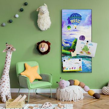 FUNKTION:  Die banjado Magnettafel mit Motiv Ballons In Lila Wolken Motiv bringt Ordnung in Ihr Zettelchaos. Fotos, Termine, Notizen oder Rezepte lassen Sich hier stilvoll mit Magneten ordnen, Sie behalten alles im Blick. An der Design Magnettafel halten alle handesüblichen Magnete. DESIGN:  Die magnetische Pinnwand mit dem Motiv Motiv Ballons In Lila Wolken ist ein eleganter Begleiter im Alltag. Mit dieser Memotafel aus Metall haben Sie auch ohne Notizen und Magnete ein schönes Dekoelement. Das Format bietet Ihnen ausreichend Platz um alle wichtigen Informationen im Blick zu behalten. DETAILS:  Die Magnettafel besteht aus silber-grau, weiß oder schwarzlackiertem Stahl. Sie hat eine Größe von 37 x 78 x 2cm. Es befinden sich auf der Rückseite vorgefertigte Aufhängungen die eine schnelle und unkomplizierte Anbringung ermöglichen. Das Motiv ist mit einem seidenmatten Laminat versehen und schützt so zusätzlich vor Kratzern. NUTZEN:  Sie können dieses Memoboard groß als Wandbild nutzen, es halten alle handelsüblichen Magneten daran. Die Pinnwand ist mit einem feuchten Lappen oder Schwamm abwischbar. Sie finden bei uns eine große Auswahl an passenden Magneten. BANJADO:  Wir sind ein kleines Team aus dem Herzen von Sachsen. Wir fertigen alle Artikel von Hand für Sie an, Sie erhalten keine preiswerte Importware. Auf Wunsch können Sie auch Ihr eigenes Foto auf die Magnettafel aufbringen, schreiben Sie uns an. Herzlichst, Ihr banjado-Team