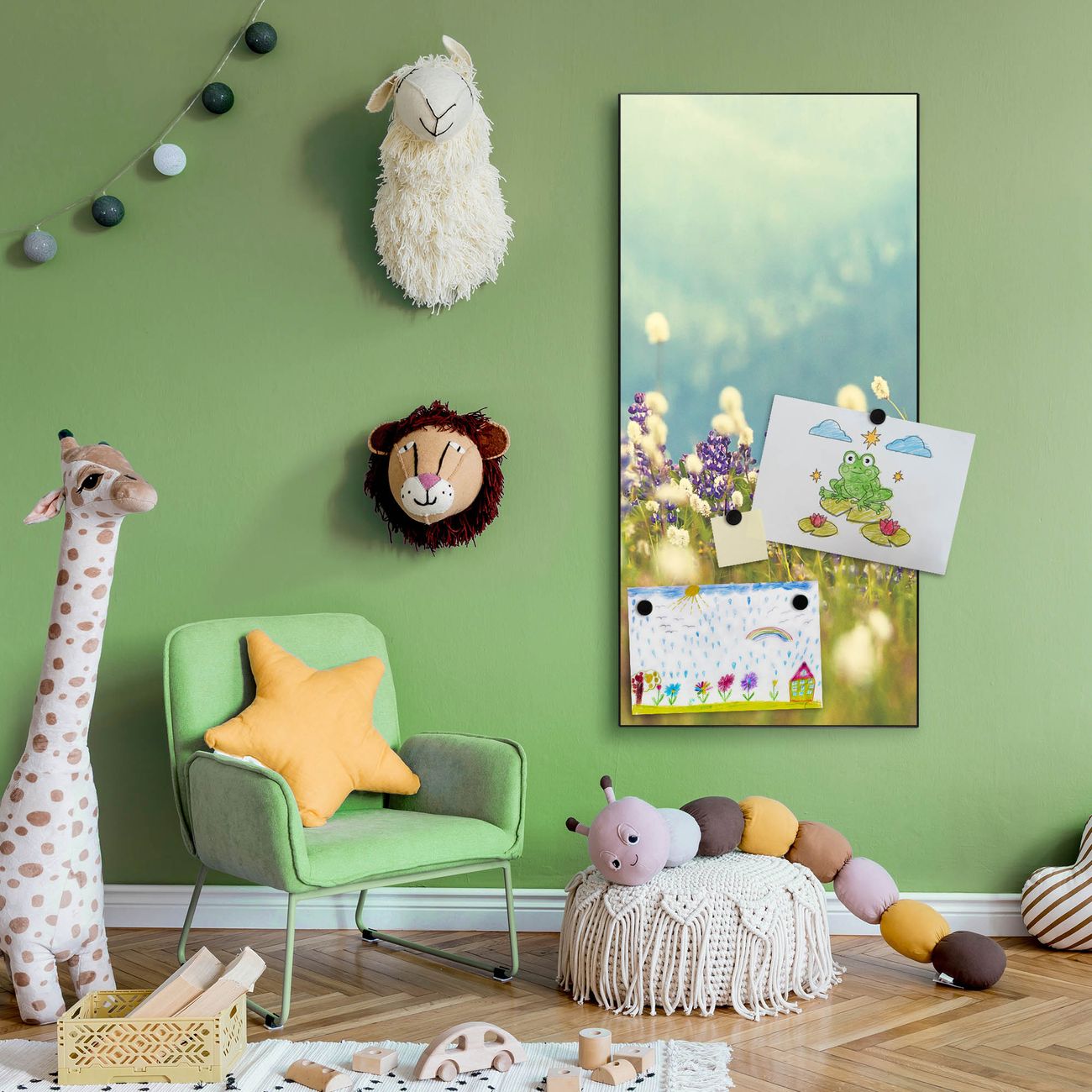 FUNKTION:  Die banjado Magnettafel mit Motiv Bergwiese Motiv bringt Ordnung in Ihr Zettelchaos. Fotos, Termine, Notizen oder Rezepte lassen Sich hier stilvoll mit Magneten ordnen, Sie behalten alles im Blick. An der Design Magnettafel halten alle handesüblichen Magnete. DESIGN:  Die magnetische Pinnwand mit dem Motiv Motiv Bergwiese ist ein eleganter Begleiter im Alltag. Mit dieser Memotafel aus Metall haben Sie auch ohne Notizen und Magnete ein schönes Dekoelement. Das Format bietet Ihnen ausreichend Platz um alle wichtigen Informationen im Blick zu behalten. DETAILS:  Die Magnettafel besteht aus silber-grau, weiß oder schwarzlackiertem Stahl. Sie hat eine Größe von 37 x 78 x 2cm. Es befinden sich auf der Rückseite vorgefertigte Aufhängungen die eine schnelle und unkomplizierte Anbringung ermöglichen. Das Motiv ist mit einem seidenmatten Laminat versehen und schützt so zusätzlich vor Kratzern. NUTZEN:  Sie können dieses Memoboard groß als Wandbild nutzen, es halten alle handelsüblichen Magneten daran. Die Pinnwand ist mit einem feuchten Lappen oder Schwamm abwischbar. Sie finden bei uns eine große Auswahl an passenden Magneten. BANJADO:  Wir sind ein kleines Team aus dem Herzen von Sachsen. Wir fertigen alle Artikel von Hand für Sie an, Sie erhalten keine preiswerte Importware. Auf Wunsch können Sie auch Ihr eigenes Foto auf die Magnettafel aufbringen, schreiben Sie uns an. Herzlichst, Ihr banjado-Team