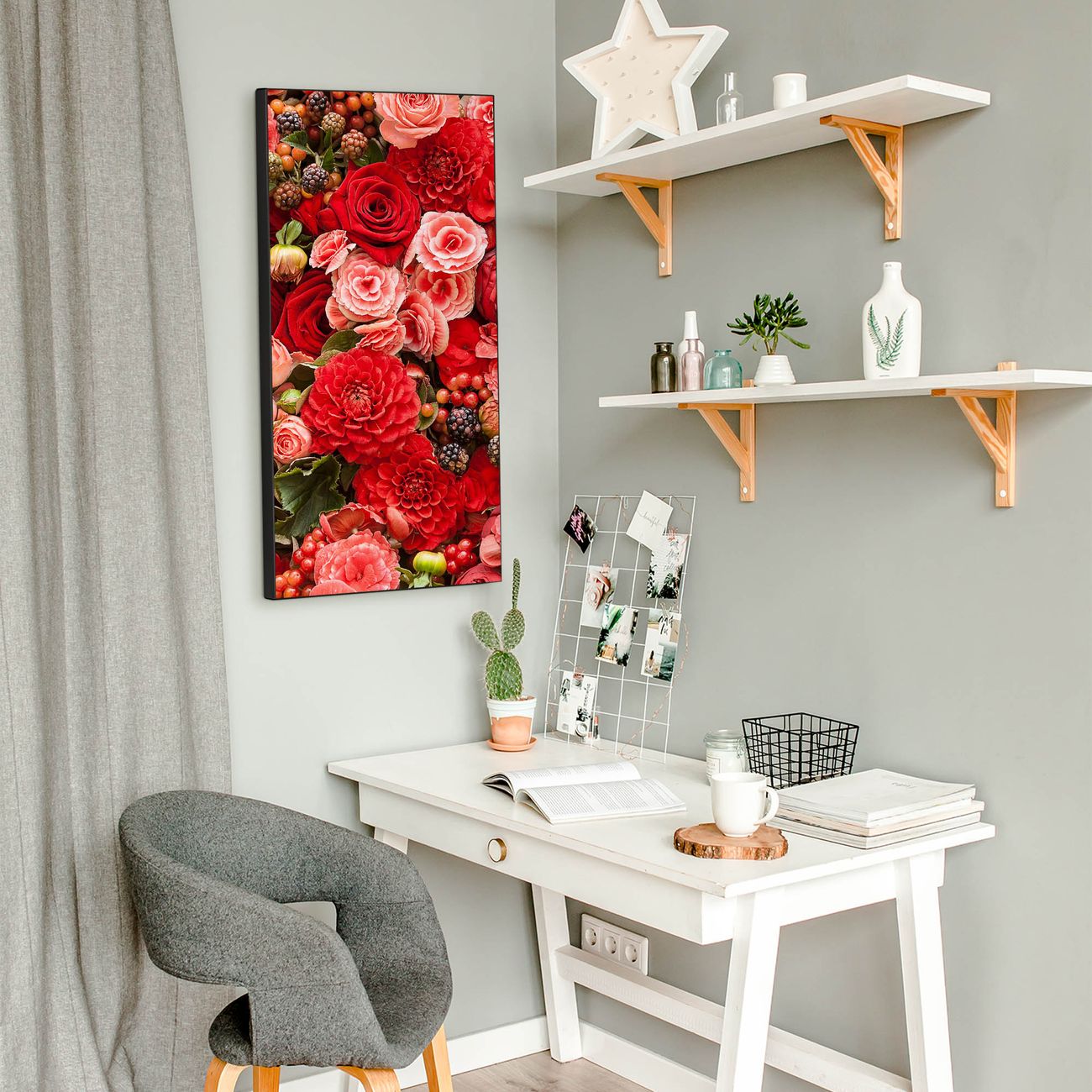FUNKTION:  Die banjado Magnettafel mit Motiv Bouquet in Rot Motiv bringt Ordnung in Ihr Zettelchaos. Fotos, Termine, Notizen oder Rezepte lassen Sich hier stilvoll mit Magneten ordnen, Sie behalten alles im Blick. An der Design Magnettafel halten alle handesüblichen Magnete. DESIGN:  Die magnetische Pinnwand mit dem Motiv Motiv Bouquet in Rot ist ein eleganter Begleiter im Alltag. Mit dieser Memotafel aus Metall haben Sie auch ohne Notizen und Magnete ein schönes Dekoelement. Das Format bietet Ihnen ausreichend Platz um alle wichtigen Informationen im Blick zu behalten. DETAILS:  Die Magnettafel besteht aus silber-grau, weiß oder schwarzlackiertem Stahl. Sie hat eine Größe von 37 x 78 x 2cm. Es befinden sich auf der Rückseite vorgefertigte Aufhängungen die eine schnelle und unkomplizierte Anbringung ermöglichen. Das Motiv ist mit einem seidenmatten Laminat versehen und schützt so zusätzlich vor Kratzern. NUTZEN:  Sie können dieses Memoboard groß als Wandbild nutzen, es halten alle handelsüblichen Magneten daran. Die Pinnwand ist mit einem feuchten Lappen oder Schwamm abwischbar. Sie finden bei uns eine große Auswahl an passenden Magneten. BANJADO:  Wir sind ein kleines Team aus dem Herzen von Sachsen. Wir fertigen alle Artikel von Hand für Sie an, Sie erhalten keine preiswerte Importware. Auf Wunsch können Sie auch Ihr eigenes Foto auf die Magnettafel aufbringen, schreiben Sie uns an. Herzlichst, Ihr banjado-Team