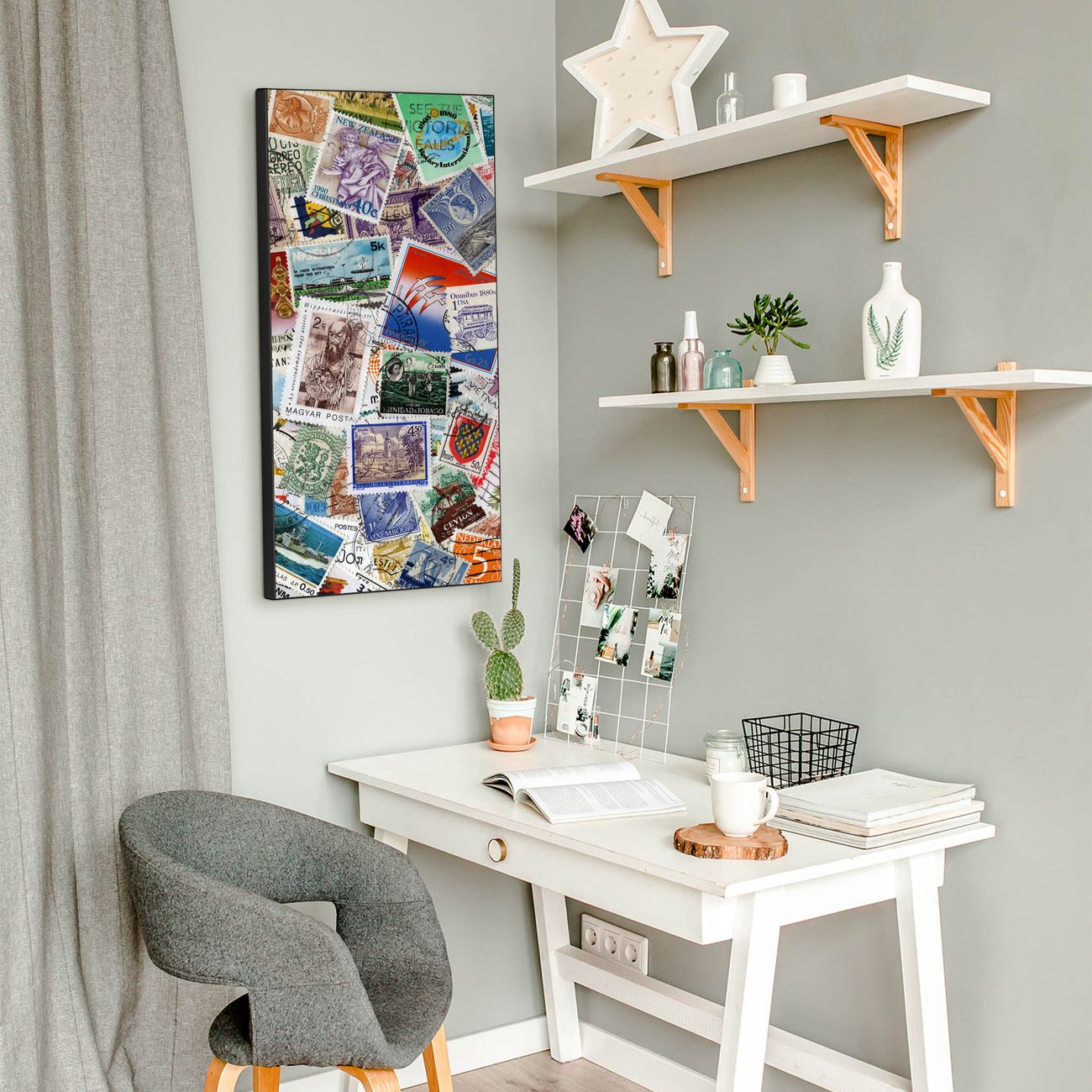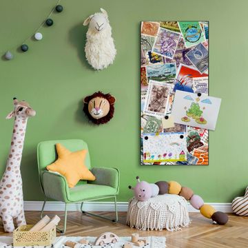 FUNKTION:  Die banjado Magnettafel mit Motiv Briefmarken Motiv bringt Ordnung in Ihr Zettelchaos. Fotos, Termine, Notizen oder Rezepte lassen Sich hier stilvoll mit Magneten ordnen, Sie behalten alles im Blick. An der Design Magnettafel halten alle handesüblichen Magnete. DESIGN:  Die magnetische Pinnwand mit dem Motiv Motiv Briefmarken ist ein eleganter Begleiter im Alltag. Mit dieser Memotafel aus Metall haben Sie auch ohne Notizen und Magnete ein schönes Dekoelement. Das Format bietet Ihnen ausreichend Platz um alle wichtigen Informationen im Blick zu behalten. DETAILS:  Die Magnettafel besteht aus silber-grau, weiß oder schwarzlackiertem Stahl. Sie hat eine Größe von 37 x 78 x 2cm. Es befinden sich auf der Rückseite vorgefertigte Aufhängungen die eine schnelle und unkomplizierte Anbringung ermöglichen. Das Motiv ist mit einem seidenmatten Laminat versehen und schützt so zusätzlich vor Kratzern. NUTZEN:  Sie können dieses Memoboard groß als Wandbild nutzen, es halten alle handelsüblichen Magneten daran. Die Pinnwand ist mit einem feuchten Lappen oder Schwamm abwischbar. Sie finden bei uns eine große Auswahl an passenden Magneten. BANJADO:  Wir sind ein kleines Team aus dem Herzen von Sachsen. Wir fertigen alle Artikel von Hand für Sie an, Sie erhalten keine preiswerte Importware. Auf Wunsch können Sie auch Ihr eigenes Foto auf die Magnettafel aufbringen, schreiben Sie uns an. Herzlichst, Ihr banjado-Team