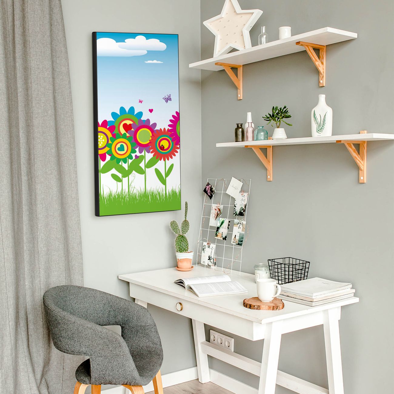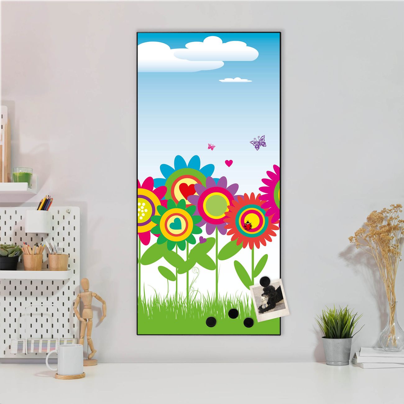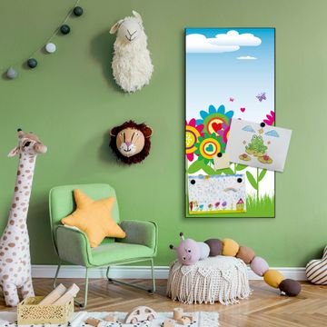FUNKTION:  Die banjado Magnettafel mit Motiv Bunte Blumen Motiv bringt Ordnung in Ihr Zettelchaos. Fotos, Termine, Notizen oder Rezepte lassen Sich hier stilvoll mit Magneten ordnen, Sie behalten alles im Blick. An der Design Magnettafel halten alle handesüblichen Magnete. DESIGN:  Die magnetische Pinnwand mit dem Motiv Motiv Bunte Blumen ist ein eleganter Begleiter im Alltag. Mit dieser Memotafel aus Metall haben Sie auch ohne Notizen und Magnete ein schönes Dekoelement. Das Format bietet Ihnen ausreichend Platz um alle wichtigen Informationen im Blick zu behalten. DETAILS:  Die Magnettafel besteht aus silber-grau, weiß oder schwarzlackiertem Stahl. Sie hat eine Größe von 37 x 78 x 2cm. Es befinden sich auf der Rückseite vorgefertigte Aufhängungen die eine schnelle und unkomplizierte Anbringung ermöglichen. Das Motiv ist mit einem seidenmatten Laminat versehen und schützt so zusätzlich vor Kratzern. NUTZEN:  Sie können dieses Memoboard groß als Wandbild nutzen, es halten alle handelsüblichen Magneten daran. Die Pinnwand ist mit einem feuchten Lappen oder Schwamm abwischbar. Sie finden bei uns eine große Auswahl an passenden Magneten. BANJADO:  Wir sind ein kleines Team aus dem Herzen von Sachsen. Wir fertigen alle Artikel von Hand für Sie an, Sie erhalten keine preiswerte Importware. Auf Wunsch können Sie auch Ihr eigenes Foto auf die Magnettafel aufbringen, schreiben Sie uns an. Herzlichst, Ihr banjado-Team