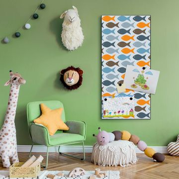FUNKTION:  Die banjado Magnettafel mit Motiv Bunte Fische Motiv bringt Ordnung in Ihr Zettelchaos. Fotos, Termine, Notizen oder Rezepte lassen Sich hier stilvoll mit Magneten ordnen, Sie behalten alles im Blick. An der Design Magnettafel halten alle handesüblichen Magnete. DESIGN:  Die magnetische Pinnwand mit dem Motiv Motiv Bunte Fische ist ein eleganter Begleiter im Alltag. Mit dieser Memotafel aus Metall haben Sie auch ohne Notizen und Magnete ein schönes Dekoelement. Das Format bietet Ihnen ausreichend Platz um alle wichtigen Informationen im Blick zu behalten. DETAILS:  Die Magnettafel besteht aus silber-grau, weiß oder schwarzlackiertem Stahl. Sie hat eine Größe von 37 x 78 x 2cm. Es befinden sich auf der Rückseite vorgefertigte Aufhängungen die eine schnelle und unkomplizierte Anbringung ermöglichen. Das Motiv ist mit einem seidenmatten Laminat versehen und schützt so zusätzlich vor Kratzern. NUTZEN:  Sie können dieses Memoboard groß als Wandbild nutzen, es halten alle handelsüblichen Magneten daran. Die Pinnwand ist mit einem feuchten Lappen oder Schwamm abwischbar. Sie finden bei uns eine große Auswahl an passenden Magneten. BANJADO:  Wir sind ein kleines Team aus dem Herzen von Sachsen. Wir fertigen alle Artikel von Hand für Sie an, Sie erhalten keine preiswerte Importware. Auf Wunsch können Sie auch Ihr eigenes Foto auf die Magnettafel aufbringen, schreiben Sie uns an. Herzlichst, Ihr banjado-Team