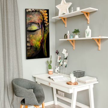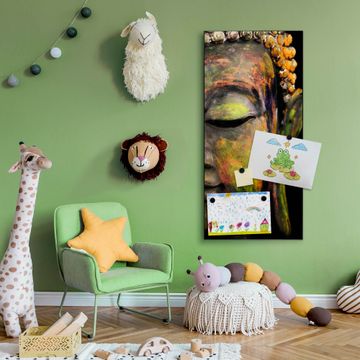 FUNKTION:  Die banjado Magnettafel mit Motiv Bunter Buddha Motiv bringt Ordnung in Ihr Zettelchaos. Fotos, Termine, Notizen oder Rezepte lassen Sich hier stilvoll mit Magneten ordnen, Sie behalten alles im Blick. An der Design Magnettafel halten alle handesüblichen Magnete. DESIGN:  Die magnetische Pinnwand mit dem Motiv Motiv Bunter Buddha ist ein eleganter Begleiter im Alltag. Mit dieser Memotafel aus Metall haben Sie auch ohne Notizen und Magnete ein schönes Dekoelement. Das Format bietet Ihnen ausreichend Platz um alle wichtigen Informationen im Blick zu behalten. DETAILS:  Die Magnettafel besteht aus silber-grau, weiß oder schwarzlackiertem Stahl. Sie hat eine Größe von 37 x 78 x 2cm. Es befinden sich auf der Rückseite vorgefertigte Aufhängungen die eine schnelle und unkomplizierte Anbringung ermöglichen. Das Motiv ist mit einem seidenmatten Laminat versehen und schützt so zusätzlich vor Kratzern. NUTZEN:  Sie können dieses Memoboard groß als Wandbild nutzen, es halten alle handelsüblichen Magneten daran. Die Pinnwand ist mit einem feuchten Lappen oder Schwamm abwischbar. Sie finden bei uns eine große Auswahl an passenden Magneten. BANJADO:  Wir sind ein kleines Team aus dem Herzen von Sachsen. Wir fertigen alle Artikel von Hand für Sie an, Sie erhalten keine preiswerte Importware. Auf Wunsch können Sie auch Ihr eigenes Foto auf die Magnettafel aufbringen, schreiben Sie uns an. Herzlichst, Ihr banjado-Team
