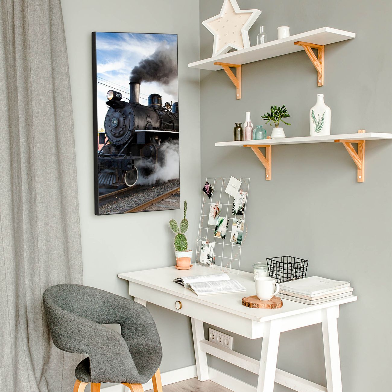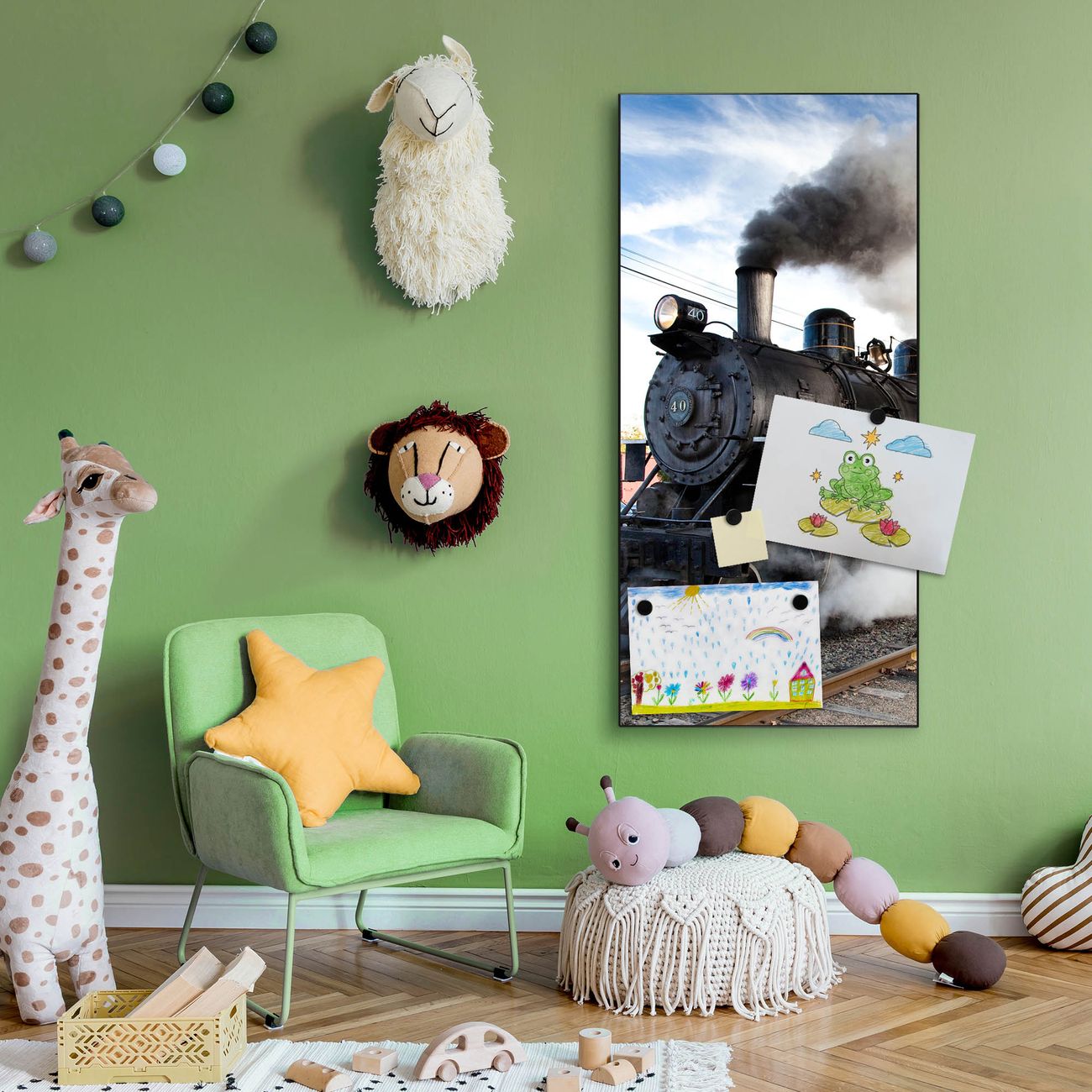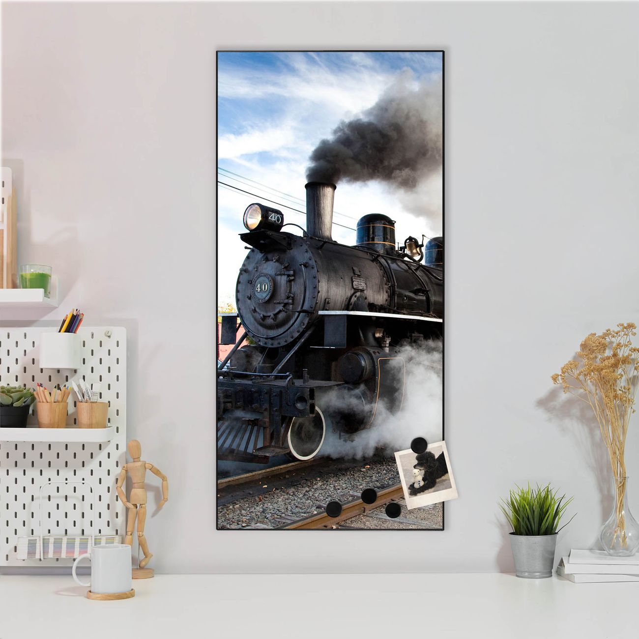 FUNKTION:  Die banjado Magnettafel mit Motiv Dampflok Motiv bringt Ordnung in Ihr Zettelchaos. Fotos, Termine, Notizen oder Rezepte lassen Sich hier stilvoll mit Magneten ordnen, Sie behalten alles im Blick. An der Design Magnettafel halten alle handesüblichen Magnete. DESIGN:  Die magnetische Pinnwand mit dem Motiv Motiv Dampflok ist ein eleganter Begleiter im Alltag. Mit dieser Memotafel aus Metall haben Sie auch ohne Notizen und Magnete ein schönes Dekoelement. Das Format bietet Ihnen ausreichend Platz um alle wichtigen Informationen im Blick zu behalten. DETAILS:  Die Magnettafel besteht aus silber-grau, weiß oder schwarzlackiertem Stahl. Sie hat eine Größe von 37 x 78 x 2cm. Es befinden sich auf der Rückseite vorgefertigte Aufhängungen die eine schnelle und unkomplizierte Anbringung ermöglichen. Das Motiv ist mit einem seidenmatten Laminat versehen und schützt so zusätzlich vor Kratzern. NUTZEN:  Sie können dieses Memoboard groß als Wandbild nutzen, es halten alle handelsüblichen Magneten daran. Die Pinnwand ist mit einem feuchten Lappen oder Schwamm abwischbar. Sie finden bei uns eine große Auswahl an passenden Magneten. BANJADO:  Wir sind ein kleines Team aus dem Herzen von Sachsen. Wir fertigen alle Artikel von Hand für Sie an, Sie erhalten keine preiswerte Importware. Auf Wunsch können Sie auch Ihr eigenes Foto auf die Magnettafel aufbringen, schreiben Sie uns an. Herzlichst, Ihr banjado-Team