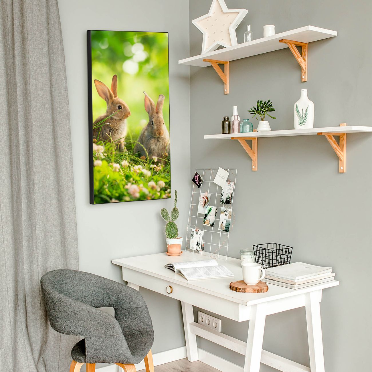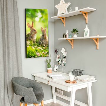 FUNKTION:  Die banjado Magnettafel mit Motiv Drei Hasen Motiv bringt Ordnung in Ihr Zettelchaos. Fotos, Termine, Notizen oder Rezepte lassen Sich hier stilvoll mit Magneten ordnen, Sie behalten alles im Blick. An der Design Magnettafel halten alle handesüblichen Magnete. DESIGN:  Die magnetische Pinnwand mit dem Motiv Motiv Drei Hasen ist ein eleganter Begleiter im Alltag. Mit dieser Memotafel aus Metall haben Sie auch ohne Notizen und Magnete ein schönes Dekoelement. Das Format bietet Ihnen ausreichend Platz um alle wichtigen Informationen im Blick zu behalten. DETAILS:  Die Magnettafel besteht aus silber-grau, weiß oder schwarzlackiertem Stahl. Sie hat eine Größe von 37 x 78 x 2cm. Es befinden sich auf der Rückseite vorgefertigte Aufhängungen die eine schnelle und unkomplizierte Anbringung ermöglichen. Das Motiv ist mit einem seidenmatten Laminat versehen und schützt so zusätzlich vor Kratzern. NUTZEN:  Sie können dieses Memoboard groß als Wandbild nutzen, es halten alle handelsüblichen Magneten daran. Die Pinnwand ist mit einem feuchten Lappen oder Schwamm abwischbar. Sie finden bei uns eine große Auswahl an passenden Magneten. BANJADO:  Wir sind ein kleines Team aus dem Herzen von Sachsen. Wir fertigen alle Artikel von Hand für Sie an, Sie erhalten keine preiswerte Importware. Auf Wunsch können Sie auch Ihr eigenes Foto auf die Magnettafel aufbringen, schreiben Sie uns an. Herzlichst, Ihr banjado-Team