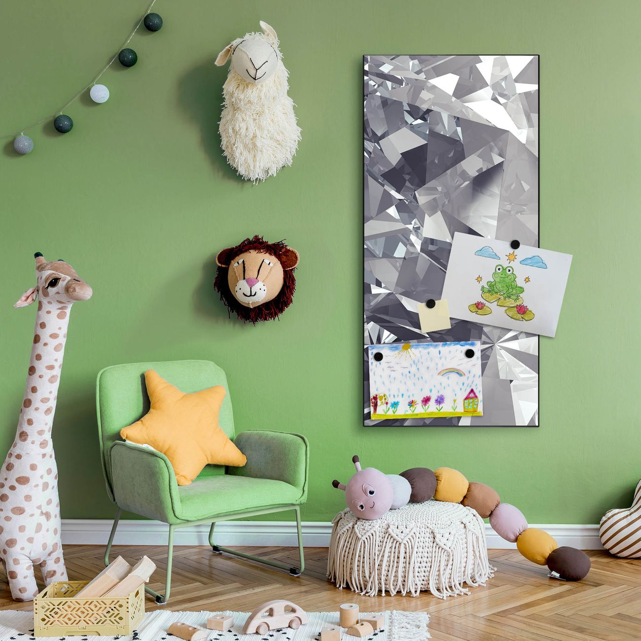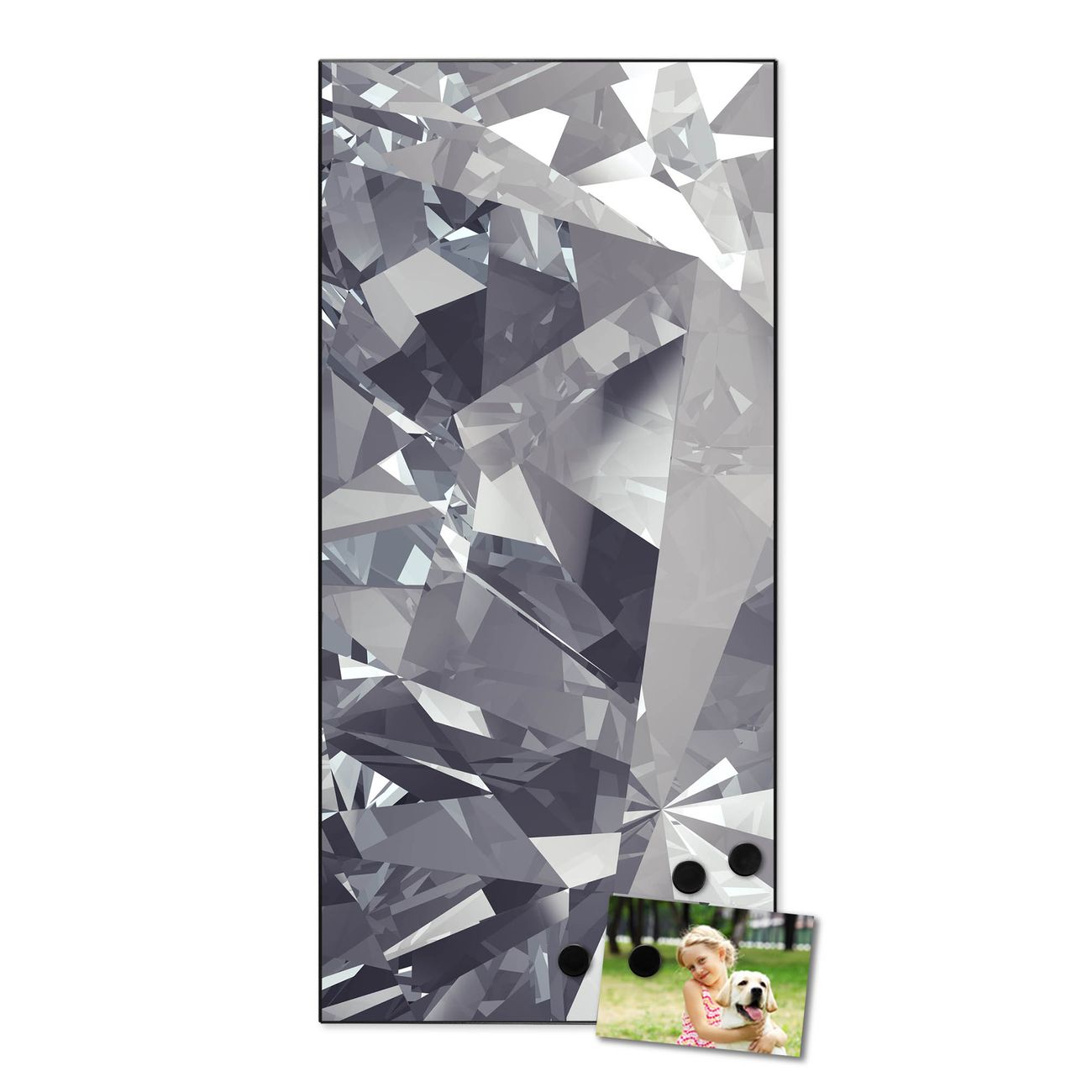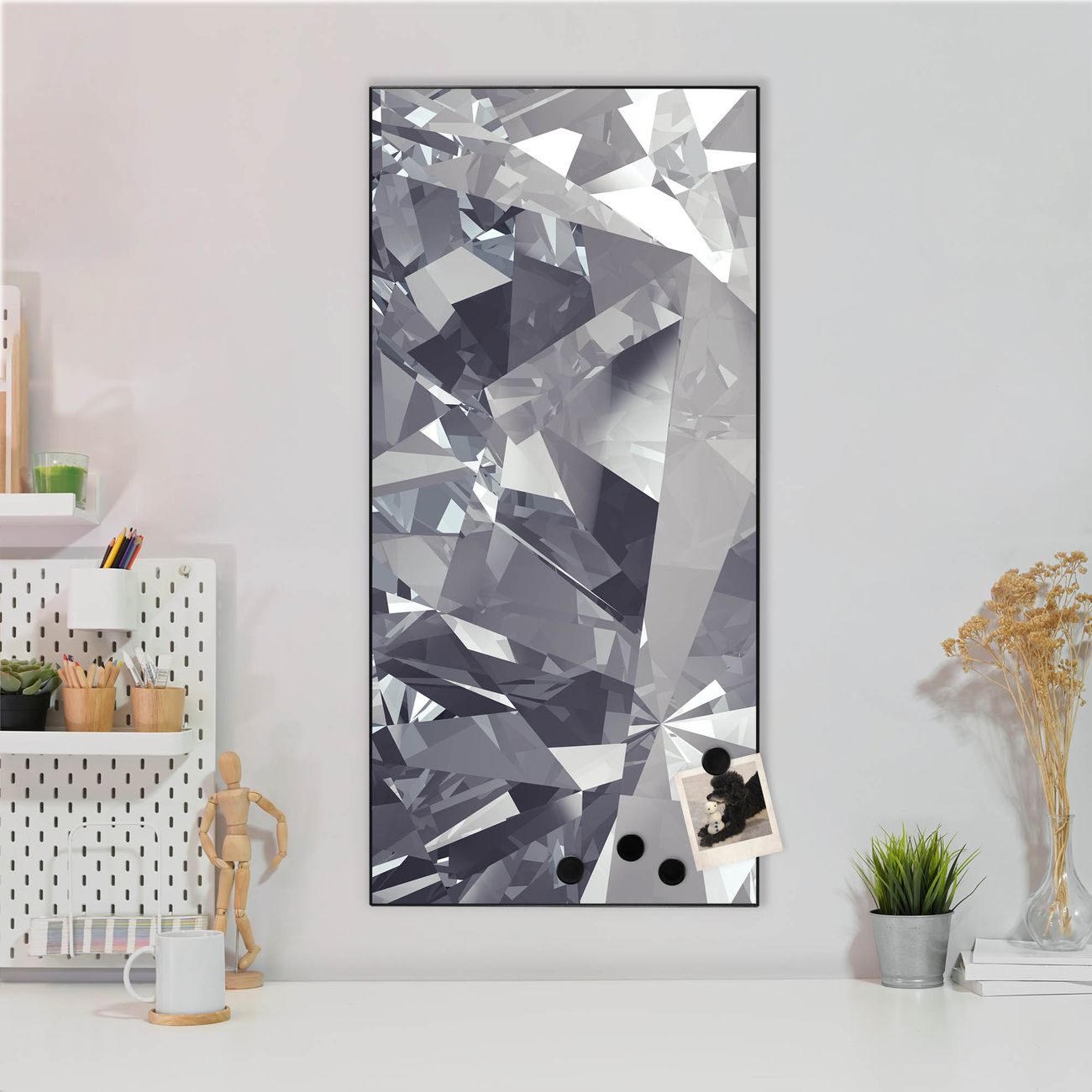 FUNKTION:  Die banjado Magnettafel mit Motiv Facetten Monochrome Motiv bringt Ordnung in Ihr Zettelchaos. Fotos, Termine, Notizen oder Rezepte lassen Sich hier stilvoll mit Magneten ordnen, Sie behalten alles im Blick. An der Design Magnettafel halten alle handesüblichen Magnete. DESIGN:  Die magnetische Pinnwand mit dem Motiv Motiv Facetten Monochrome ist ein eleganter Begleiter im Alltag. Mit dieser Memotafel aus Metall haben Sie auch ohne Notizen und Magnete ein schönes Dekoelement. Das Format bietet Ihnen ausreichend Platz um alle wichtigen Informationen im Blick zu behalten. DETAILS:  Die Magnettafel besteht aus silber-grau, weiß oder schwarzlackiertem Stahl. Sie hat eine Größe von 37 x 78 x 2cm. Es befinden sich auf der Rückseite vorgefertigte Aufhängungen die eine schnelle und unkomplizierte Anbringung ermöglichen. Das Motiv ist mit einem seidenmatten Laminat versehen und schützt so zusätzlich vor Kratzern. NUTZEN:  Sie können dieses Memoboard groß als Wandbild nutzen, es halten alle handelsüblichen Magneten daran. Die Pinnwand ist mit einem feuchten Lappen oder Schwamm abwischbar. Sie finden bei uns eine große Auswahl an passenden Magneten. BANJADO:  Wir sind ein kleines Team aus dem Herzen von Sachsen. Wir fertigen alle Artikel von Hand für Sie an, Sie erhalten keine preiswerte Importware. Auf Wunsch können Sie auch Ihr eigenes Foto auf die Magnettafel aufbringen, schreiben Sie uns an. Herzlichst, Ihr banjado-Team
