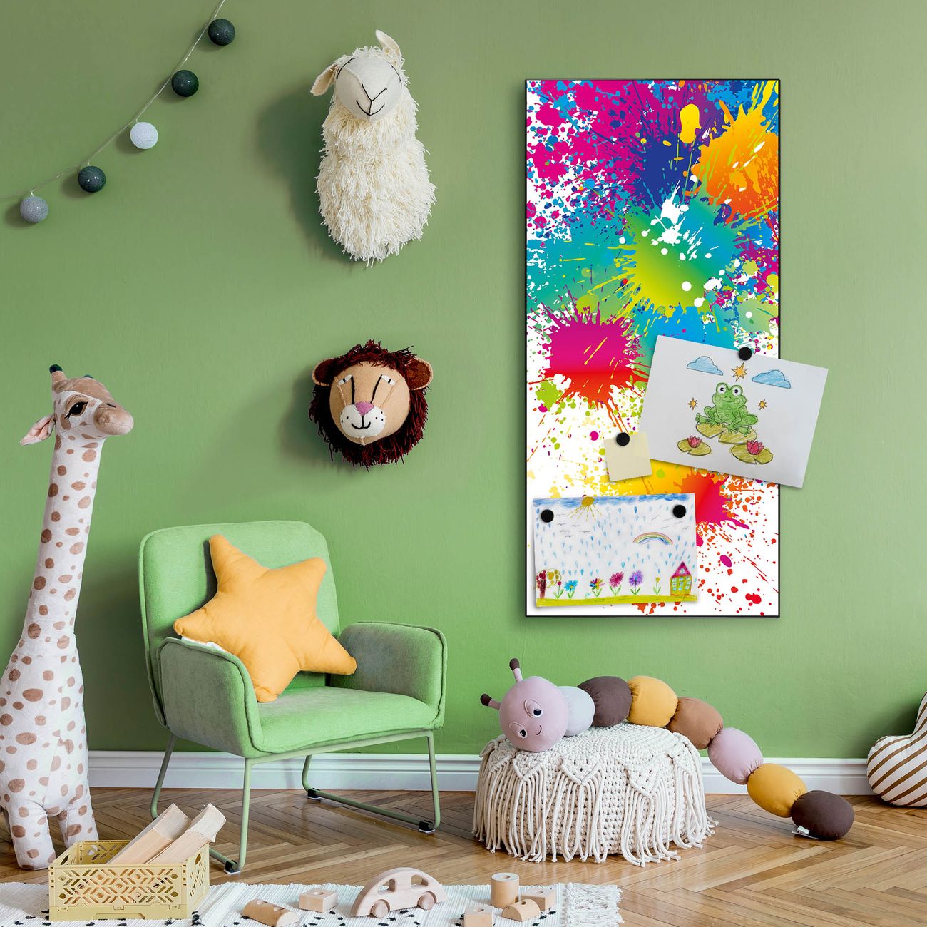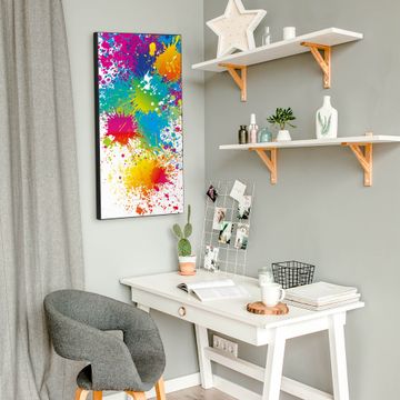 FUNKTION:  Die banjado Magnettafel mit Motiv Farbspritzer Motiv bringt Ordnung in Ihr Zettelchaos. Fotos, Termine, Notizen oder Rezepte lassen Sich hier stilvoll mit Magneten ordnen, Sie behalten alles im Blick. An der Design Magnettafel halten alle handesüblichen Magnete. DESIGN:  Die magnetische Pinnwand mit dem Motiv Motiv Farbspritzer ist ein eleganter Begleiter im Alltag. Mit dieser Memotafel aus Metall haben Sie auch ohne Notizen und Magnete ein schönes Dekoelement. Das Format bietet Ihnen ausreichend Platz um alle wichtigen Informationen im Blick zu behalten. DETAILS:  Die Magnettafel besteht aus silber-grau, weiß oder schwarzlackiertem Stahl. Sie hat eine Größe von 37 x 78 x 2cm. Es befinden sich auf der Rückseite vorgefertigte Aufhängungen die eine schnelle und unkomplizierte Anbringung ermöglichen. Das Motiv ist mit einem seidenmatten Laminat versehen und schützt so zusätzlich vor Kratzern. NUTZEN:  Sie können dieses Memoboard groß als Wandbild nutzen, es halten alle handelsüblichen Magneten daran. Die Pinnwand ist mit einem feuchten Lappen oder Schwamm abwischbar. Sie finden bei uns eine große Auswahl an passenden Magneten. BANJADO:  Wir sind ein kleines Team aus dem Herzen von Sachsen. Wir fertigen alle Artikel von Hand für Sie an, Sie erhalten keine preiswerte Importware. Auf Wunsch können Sie auch Ihr eigenes Foto auf die Magnettafel aufbringen, schreiben Sie uns an. Herzlichst, Ihr banjado-Team