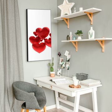 FUNKTION:  Die banjado Magnettafel mit Motiv Fliegende Herzen Motiv bringt Ordnung in Ihr Zettelchaos. Fotos, Termine, Notizen oder Rezepte lassen Sich hier stilvoll mit Magneten ordnen, Sie behalten alles im Blick. An der Design Magnettafel halten alle handesüblichen Magnete. DESIGN:  Die magnetische Pinnwand mit dem Motiv Motiv Fliegende Herzen ist ein eleganter Begleiter im Alltag. Mit dieser Memotafel aus Metall haben Sie auch ohne Notizen und Magnete ein schönes Dekoelement. Das Format bietet Ihnen ausreichend Platz um alle wichtigen Informationen im Blick zu behalten. DETAILS:  Die Magnettafel besteht aus silber-grau, weiß oder schwarzlackiertem Stahl. Sie hat eine Größe von 37 x 78 x 2cm. Es befinden sich auf der Rückseite vorgefertigte Aufhängungen die eine schnelle und unkomplizierte Anbringung ermöglichen. Das Motiv ist mit einem seidenmatten Laminat versehen und schützt so zusätzlich vor Kratzern. NUTZEN:  Sie können dieses Memoboard groß als Wandbild nutzen, es halten alle handelsüblichen Magneten daran. Die Pinnwand ist mit einem feuchten Lappen oder Schwamm abwischbar. Sie finden bei uns eine große Auswahl an passenden Magneten. BANJADO:  Wir sind ein kleines Team aus dem Herzen von Sachsen. Wir fertigen alle Artikel von Hand für Sie an, Sie erhalten keine preiswerte Importware. Auf Wunsch können Sie auch Ihr eigenes Foto auf die Magnettafel aufbringen, schreiben Sie uns an. Herzlichst, Ihr banjado-Team