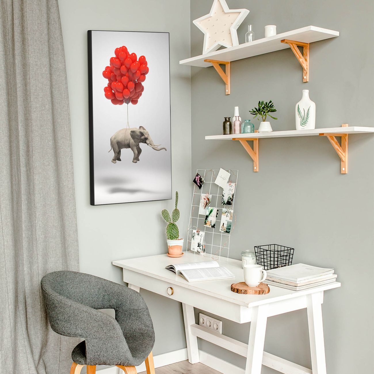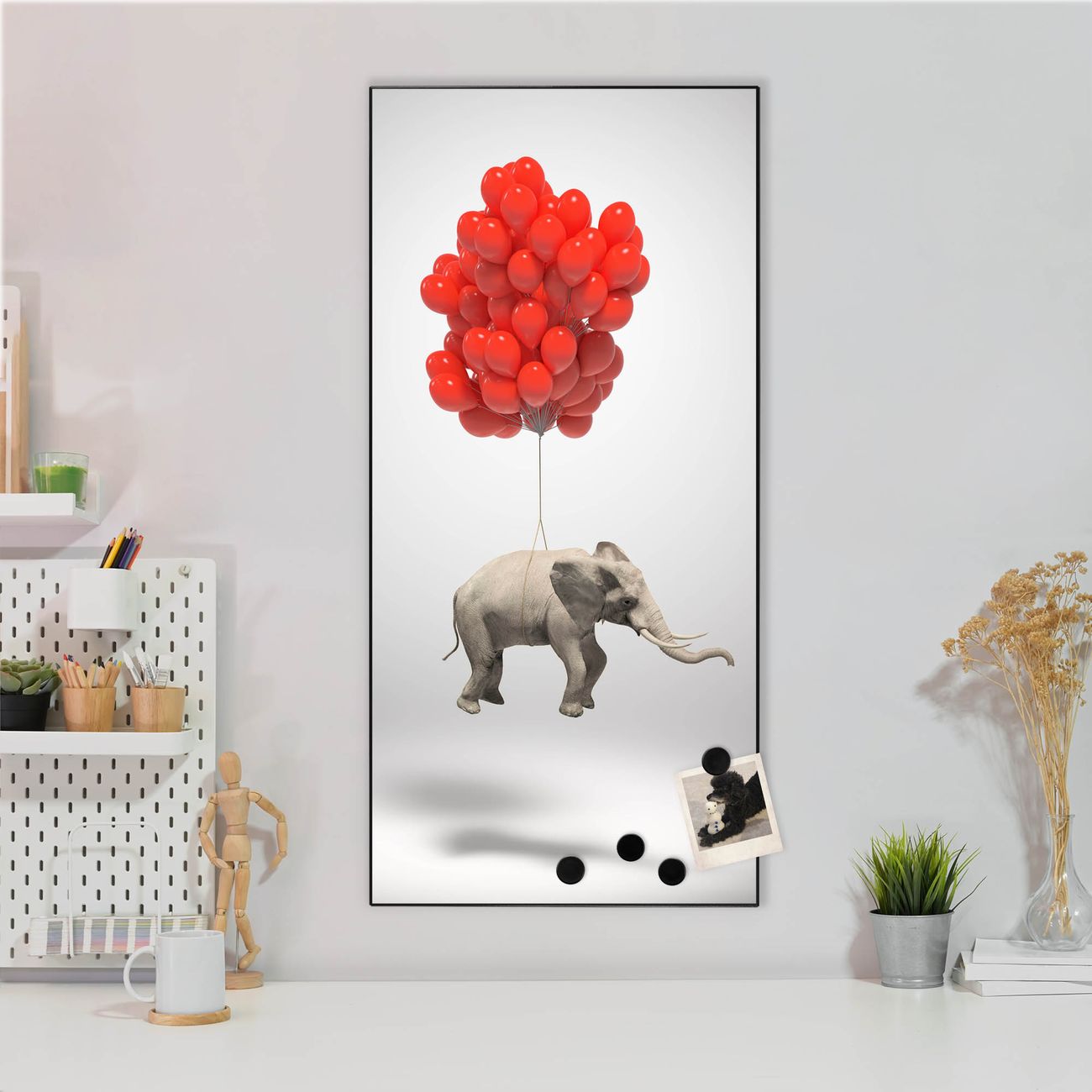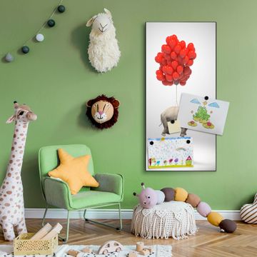 FUNKTION:  Die banjado Magnettafel mit Motiv Fliegender Elefant Motiv bringt Ordnung in Ihr Zettelchaos. Fotos, Termine, Notizen oder Rezepte lassen Sich hier stilvoll mit Magneten ordnen, Sie behalten alles im Blick. An der Design Magnettafel halten alle handesüblichen Magnete. DESIGN:  Die magnetische Pinnwand mit dem Motiv Motiv Fliegender Elefant ist ein eleganter Begleiter im Alltag. Mit dieser Memotafel aus Metall haben Sie auch ohne Notizen und Magnete ein schönes Dekoelement. Das Format bietet Ihnen ausreichend Platz um alle wichtigen Informationen im Blick zu behalten. DETAILS:  Die Magnettafel besteht aus silber-grau, weiß oder schwarzlackiertem Stahl. Sie hat eine Größe von 37 x 78 x 2cm. Es befinden sich auf der Rückseite vorgefertigte Aufhängungen die eine schnelle und unkomplizierte Anbringung ermöglichen. Das Motiv ist mit einem seidenmatten Laminat versehen und schützt so zusätzlich vor Kratzern. NUTZEN:  Sie können dieses Memoboard groß als Wandbild nutzen, es halten alle handelsüblichen Magneten daran. Die Pinnwand ist mit einem feuchten Lappen oder Schwamm abwischbar. Sie finden bei uns eine große Auswahl an passenden Magneten. BANJADO:  Wir sind ein kleines Team aus dem Herzen von Sachsen. Wir fertigen alle Artikel von Hand für Sie an, Sie erhalten keine preiswerte Importware. Auf Wunsch können Sie auch Ihr eigenes Foto auf die Magnettafel aufbringen, schreiben Sie uns an. Herzlichst, Ihr banjado-Team