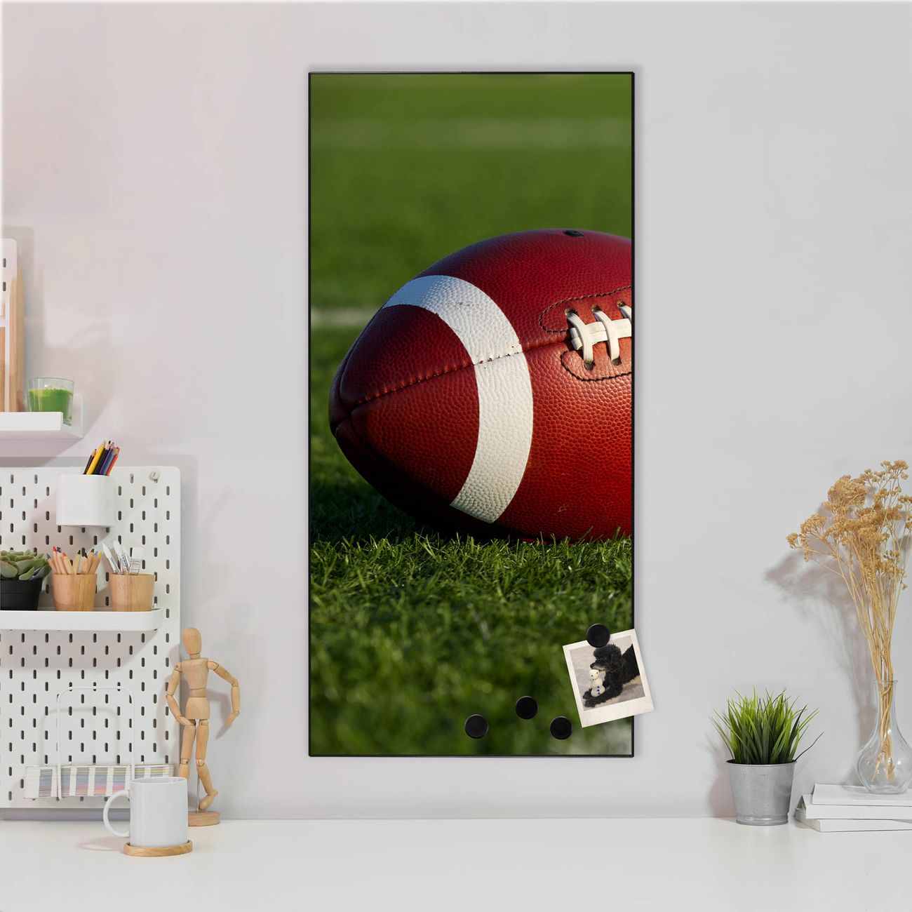 FUNKTION:  Die banjado Magnettafel mit Motiv Football Motiv bringt Ordnung in Ihr Zettelchaos. Fotos, Termine, Notizen oder Rezepte lassen Sich hier stilvoll mit Magneten ordnen, Sie behalten alles im Blick. An der Design Magnettafel halten alle handesüblichen Magnete. DESIGN:  Die magnetische Pinnwand mit dem Motiv Motiv Football ist ein eleganter Begleiter im Alltag. Mit dieser Memotafel aus Metall haben Sie auch ohne Notizen und Magnete ein schönes Dekoelement. Das Format bietet Ihnen ausreichend Platz um alle wichtigen Informationen im Blick zu behalten. DETAILS:  Die Magnettafel besteht aus silber-grau, weiß oder schwarzlackiertem Stahl. Sie hat eine Größe von 37 x 78 x 2cm. Es befinden sich auf der Rückseite vorgefertigte Aufhängungen die eine schnelle und unkomplizierte Anbringung ermöglichen. Das Motiv ist mit einem seidenmatten Laminat versehen und schützt so zusätzlich vor Kratzern. NUTZEN:  Sie können dieses Memoboard groß als Wandbild nutzen, es halten alle handelsüblichen Magneten daran. Die Pinnwand ist mit einem feuchten Lappen oder Schwamm abwischbar. Sie finden bei uns eine große Auswahl an passenden Magneten. BANJADO:  Wir sind ein kleines Team aus dem Herzen von Sachsen. Wir fertigen alle Artikel von Hand für Sie an, Sie erhalten keine preiswerte Importware. Auf Wunsch können Sie auch Ihr eigenes Foto auf die Magnettafel aufbringen, schreiben Sie uns an. Herzlichst, Ihr banjado-Team