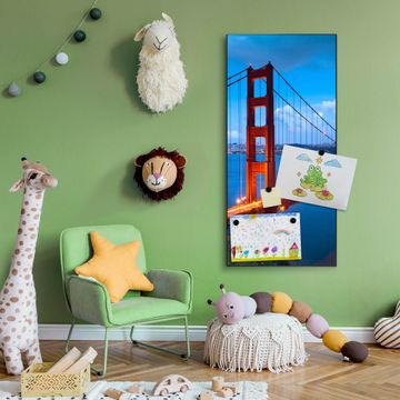 FUNKTION:  Die banjado Magnettafel mit Motiv Golden Gate Bridge Motiv bringt Ordnung in Ihr Zettelchaos. Fotos, Termine, Notizen oder Rezepte lassen Sich hier stilvoll mit Magneten ordnen, Sie behalten alles im Blick. An der Design Magnettafel halten alle handesüblichen Magnete. DESIGN:  Die magnetische Pinnwand mit dem Motiv Motiv Golden Gate Bridge ist ein eleganter Begleiter im Alltag. Mit dieser Memotafel aus Metall haben Sie auch ohne Notizen und Magnete ein schönes Dekoelement. Das Format bietet Ihnen ausreichend Platz um alle wichtigen Informationen im Blick zu behalten. DETAILS:  Die Magnettafel besteht aus silber-grau, weiß oder schwarzlackiertem Stahl. Sie hat eine Größe von 37 x 78 x 2cm. Es befinden sich auf der Rückseite vorgefertigte Aufhängungen die eine schnelle und unkomplizierte Anbringung ermöglichen. Das Motiv ist mit einem seidenmatten Laminat versehen und schützt so zusätzlich vor Kratzern. NUTZEN:  Sie können dieses Memoboard groß als Wandbild nutzen, es halten alle handelsüblichen Magneten daran. Die Pinnwand ist mit einem feuchten Lappen oder Schwamm abwischbar. Sie finden bei uns eine große Auswahl an passenden Magneten. BANJADO:  Wir sind ein kleines Team aus dem Herzen von Sachsen. Wir fertigen alle Artikel von Hand für Sie an, Sie erhalten keine preiswerte Importware. Auf Wunsch können Sie auch Ihr eigenes Foto auf die Magnettafel aufbringen, schreiben Sie uns an. Herzlichst, Ihr banjado-Team