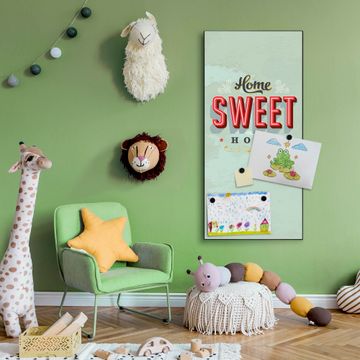 FUNKTION:  Die banjado Magnettafel mit Motiv Home Sweet Home Motiv bringt Ordnung in Ihr Zettelchaos. Fotos, Termine, Notizen oder Rezepte lassen Sich hier stilvoll mit Magneten ordnen, Sie behalten alles im Blick. An der Design Magnettafel halten alle handesüblichen Magnete. DESIGN:  Die magnetische Pinnwand mit dem Motiv Motiv Home Sweet Home ist ein eleganter Begleiter im Alltag. Mit dieser Memotafel aus Metall haben Sie auch ohne Notizen und Magnete ein schönes Dekoelement. Das Format bietet Ihnen ausreichend Platz um alle wichtigen Informationen im Blick zu behalten. DETAILS:  Die Magnettafel besteht aus silber-grau, weiß oder schwarzlackiertem Stahl. Sie hat eine Größe von 37 x 78 x 2cm. Es befinden sich auf der Rückseite vorgefertigte Aufhängungen die eine schnelle und unkomplizierte Anbringung ermöglichen. Das Motiv ist mit einem seidenmatten Laminat versehen und schützt so zusätzlich vor Kratzern. NUTZEN:  Sie können dieses Memoboard groß als Wandbild nutzen, es halten alle handelsüblichen Magneten daran. Die Pinnwand ist mit einem feuchten Lappen oder Schwamm abwischbar. Sie finden bei uns eine große Auswahl an passenden Magneten. BANJADO:  Wir sind ein kleines Team aus dem Herzen von Sachsen. Wir fertigen alle Artikel von Hand für Sie an, Sie erhalten keine preiswerte Importware. Auf Wunsch können Sie auch Ihr eigenes Foto auf die Magnettafel aufbringen, schreiben Sie uns an. Herzlichst, Ihr banjado-Team