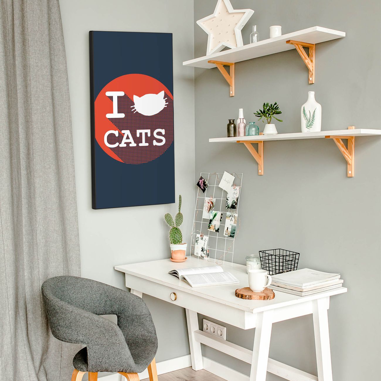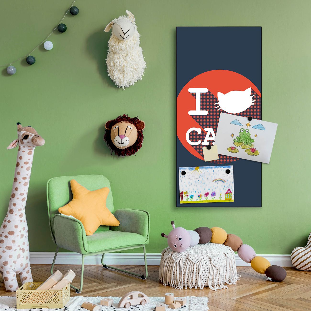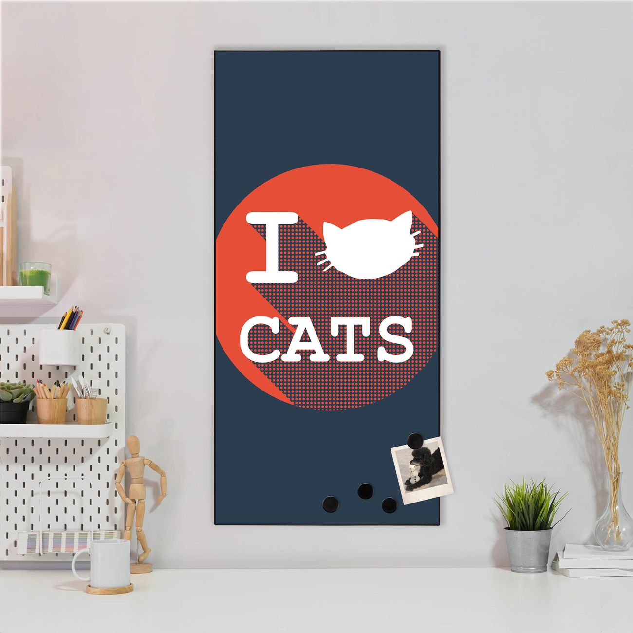FUNKTION:  Die banjado Magnettafel mit Motiv I Love Cats Motiv bringt Ordnung in Ihr Zettelchaos. Fotos, Termine, Notizen oder Rezepte lassen Sich hier stilvoll mit Magneten ordnen, Sie behalten alles im Blick. An der Design Magnettafel halten alle handesüblichen Magnete. DESIGN:  Die magnetische Pinnwand mit dem Motiv Motiv I Love Cats ist ein eleganter Begleiter im Alltag. Mit dieser Memotafel aus Metall haben Sie auch ohne Notizen und Magnete ein schönes Dekoelement. Das Format bietet Ihnen ausreichend Platz um alle wichtigen Informationen im Blick zu behalten. DETAILS:  Die Magnettafel besteht aus silber-grau, weiß oder schwarzlackiertem Stahl. Sie hat eine Größe von 37 x 78 x 2cm. Es befinden sich auf der Rückseite vorgefertigte Aufhängungen die eine schnelle und unkomplizierte Anbringung ermöglichen. Das Motiv ist mit einem seidenmatten Laminat versehen und schützt so zusätzlich vor Kratzern. NUTZEN:  Sie können dieses Memoboard groß als Wandbild nutzen, es halten alle handelsüblichen Magneten daran. Die Pinnwand ist mit einem feuchten Lappen oder Schwamm abwischbar. Sie finden bei uns eine große Auswahl an passenden Magneten. BANJADO:  Wir sind ein kleines Team aus dem Herzen von Sachsen. Wir fertigen alle Artikel von Hand für Sie an, Sie erhalten keine preiswerte Importware. Auf Wunsch können Sie auch Ihr eigenes Foto auf die Magnettafel aufbringen, schreiben Sie uns an. Herzlichst, Ihr banjado-Team