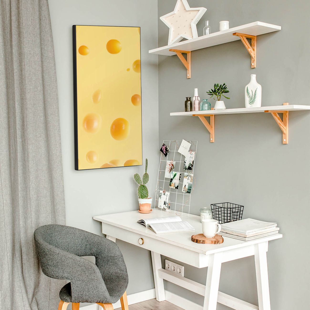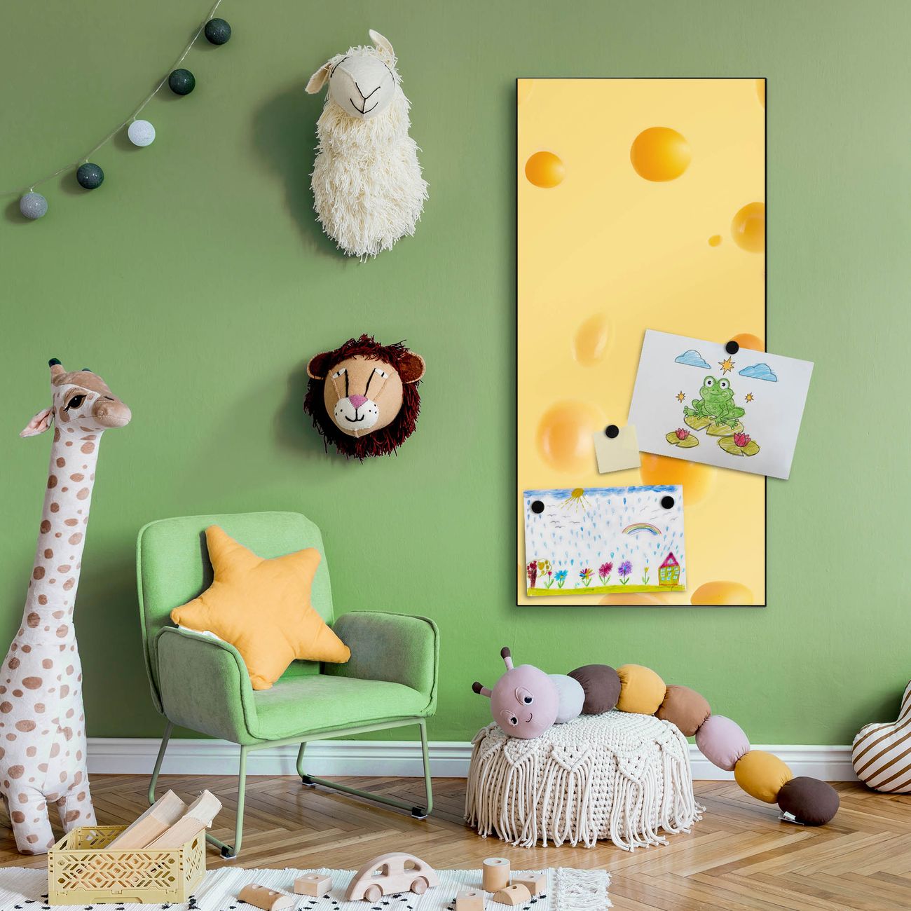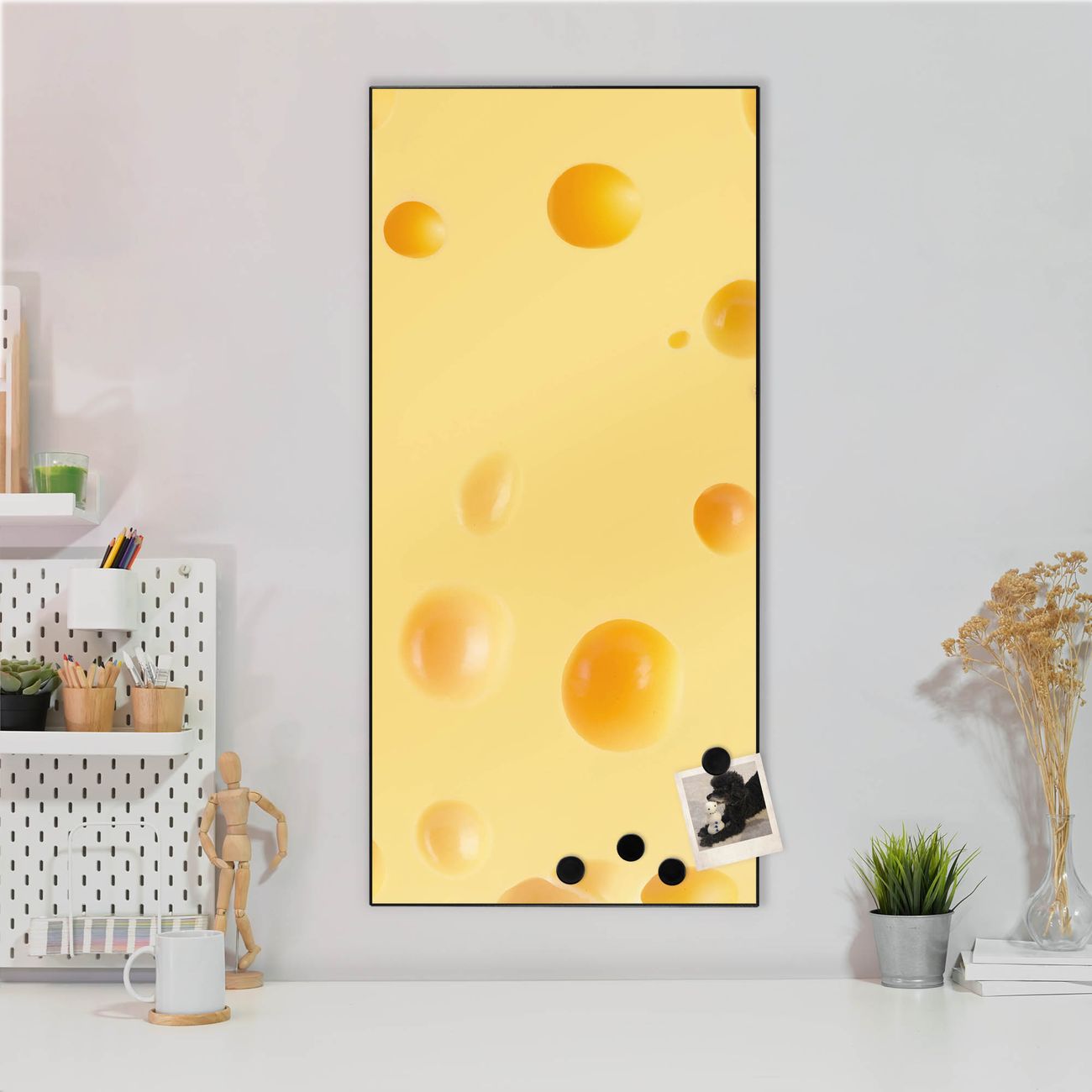 FUNKTION:  Die banjado Magnettafel mit Motiv Käse Motiv bringt Ordnung in Ihr Zettelchaos. Fotos, Termine, Notizen oder Rezepte lassen Sich hier stilvoll mit Magneten ordnen, Sie behalten alles im Blick. An der Design Magnettafel halten alle handesüblichen Magnete. DESIGN:  Die magnetische Pinnwand mit dem Motiv Motiv Käse ist ein eleganter Begleiter im Alltag. Mit dieser Memotafel aus Metall haben Sie auch ohne Notizen und Magnete ein schönes Dekoelement. Das Format bietet Ihnen ausreichend Platz um alle wichtigen Informationen im Blick zu behalten. DETAILS:  Die Magnettafel besteht aus silber-grau, weiß oder schwarzlackiertem Stahl. Sie hat eine Größe von 37 x 78 x 2cm. Es befinden sich auf der Rückseite vorgefertigte Aufhängungen die eine schnelle und unkomplizierte Anbringung ermöglichen. Das Motiv ist mit einem seidenmatten Laminat versehen und schützt so zusätzlich vor Kratzern. NUTZEN:  Sie können dieses Memoboard groß als Wandbild nutzen, es halten alle handelsüblichen Magneten daran. Die Pinnwand ist mit einem feuchten Lappen oder Schwamm abwischbar. Sie finden bei uns eine große Auswahl an passenden Magneten. BANJADO:  Wir sind ein kleines Team aus dem Herzen von Sachsen. Wir fertigen alle Artikel von Hand für Sie an, Sie erhalten keine preiswerte Importware. Auf Wunsch können Sie auch Ihr eigenes Foto auf die Magnettafel aufbringen, schreiben Sie uns an. Herzlichst, Ihr banjado-Team