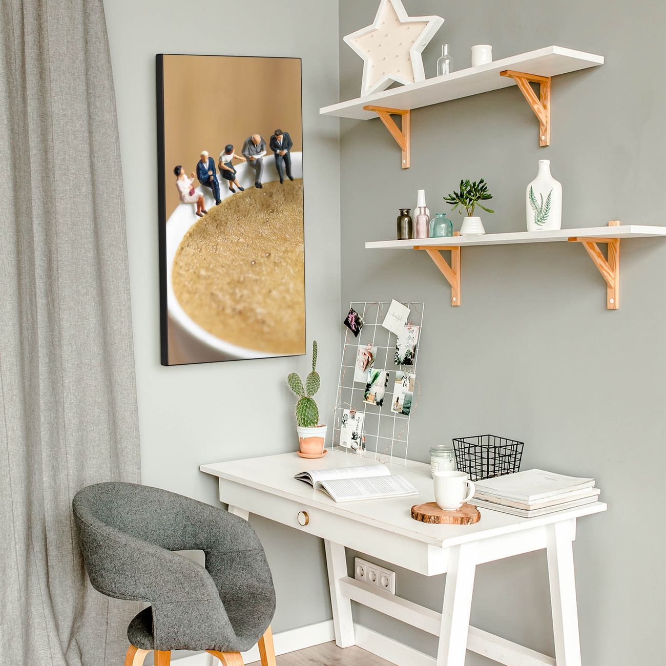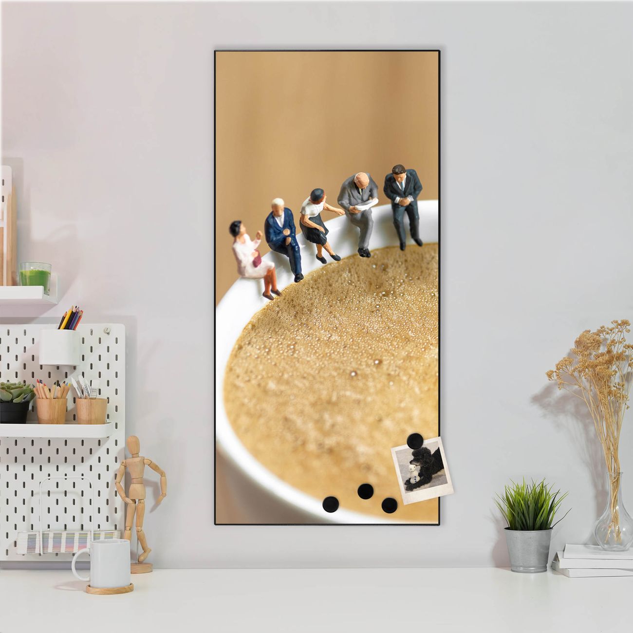 FUNKTION:  Die banjado Magnettafel mit Motiv Kaffeepause Motiv bringt Ordnung in Ihr Zettelchaos. Fotos, Termine, Notizen oder Rezepte lassen Sich hier stilvoll mit Magneten ordnen, Sie behalten alles im Blick. An der Design Magnettafel halten alle handesüblichen Magnete. DESIGN:  Die magnetische Pinnwand mit dem Motiv Motiv Kaffeepause ist ein eleganter Begleiter im Alltag. Mit dieser Memotafel aus Metall haben Sie auch ohne Notizen und Magnete ein schönes Dekoelement. Das Format bietet Ihnen ausreichend Platz um alle wichtigen Informationen im Blick zu behalten. DETAILS:  Die Magnettafel besteht aus silber-grau, weiß oder schwarzlackiertem Stahl. Sie hat eine Größe von 37 x 78 x 2cm. Es befinden sich auf der Rückseite vorgefertigte Aufhängungen die eine schnelle und unkomplizierte Anbringung ermöglichen. Das Motiv ist mit einem seidenmatten Laminat versehen und schützt so zusätzlich vor Kratzern. NUTZEN:  Sie können dieses Memoboard groß als Wandbild nutzen, es halten alle handelsüblichen Magneten daran. Die Pinnwand ist mit einem feuchten Lappen oder Schwamm abwischbar. Sie finden bei uns eine große Auswahl an passenden Magneten. BANJADO:  Wir sind ein kleines Team aus dem Herzen von Sachsen. Wir fertigen alle Artikel von Hand für Sie an, Sie erhalten keine preiswerte Importware. Auf Wunsch können Sie auch Ihr eigenes Foto auf die Magnettafel aufbringen, schreiben Sie uns an. Herzlichst, Ihr banjado-Team