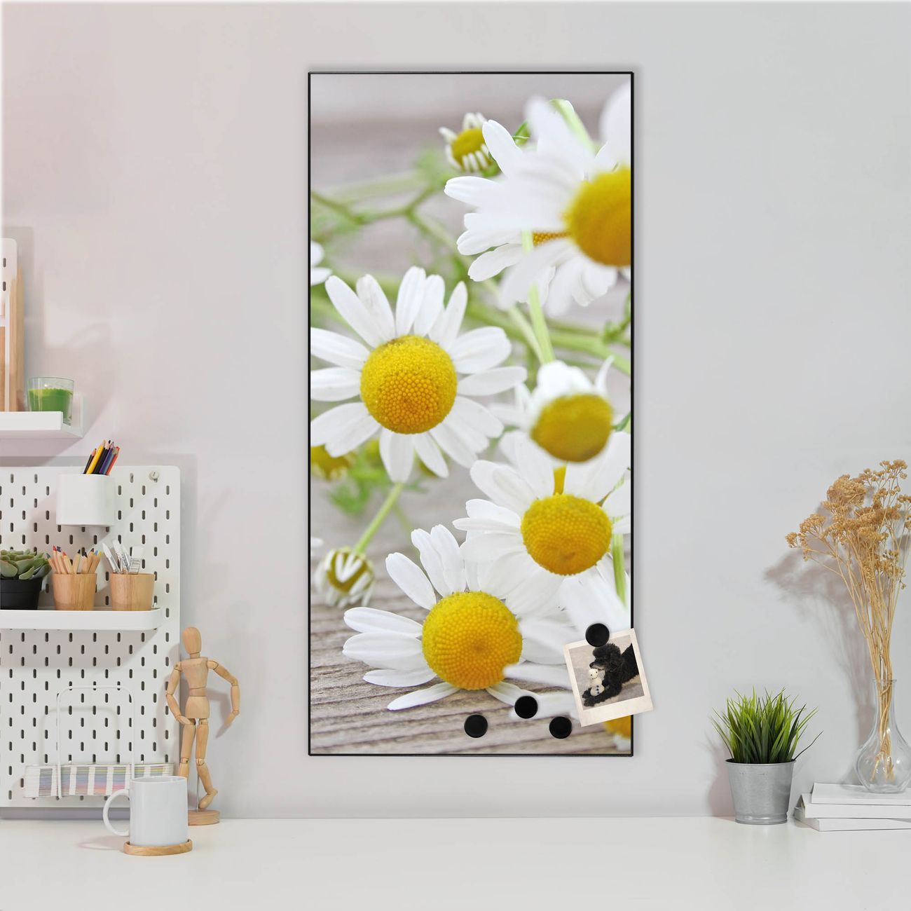 FUNKTION:  Die banjado Magnettafel mit Motiv Kamillenblüten Motiv bringt Ordnung in Ihr Zettelchaos. Fotos, Termine, Notizen oder Rezepte lassen Sich hier stilvoll mit Magneten ordnen, Sie behalten alles im Blick. An der Design Magnettafel halten alle handesüblichen Magnete. DESIGN:  Die magnetische Pinnwand mit dem Motiv Motiv Kamillenblüten ist ein eleganter Begleiter im Alltag. Mit dieser Memotafel aus Metall haben Sie auch ohne Notizen und Magnete ein schönes Dekoelement. Das Format bietet Ihnen ausreichend Platz um alle wichtigen Informationen im Blick zu behalten. DETAILS:  Die Magnettafel besteht aus silber-grau, weiß oder schwarzlackiertem Stahl. Sie hat eine Größe von 37 x 78 x 2cm. Es befinden sich auf der Rückseite vorgefertigte Aufhängungen die eine schnelle und unkomplizierte Anbringung ermöglichen. Das Motiv ist mit einem seidenmatten Laminat versehen und schützt so zusätzlich vor Kratzern. NUTZEN:  Sie können dieses Memoboard groß als Wandbild nutzen, es halten alle handelsüblichen Magneten daran. Die Pinnwand ist mit einem feuchten Lappen oder Schwamm abwischbar. Sie finden bei uns eine große Auswahl an passenden Magneten. BANJADO:  Wir sind ein kleines Team aus dem Herzen von Sachsen. Wir fertigen alle Artikel von Hand für Sie an, Sie erhalten keine preiswerte Importware. Auf Wunsch können Sie auch Ihr eigenes Foto auf die Magnettafel aufbringen, schreiben Sie uns an. Herzlichst, Ihr banjado-Team