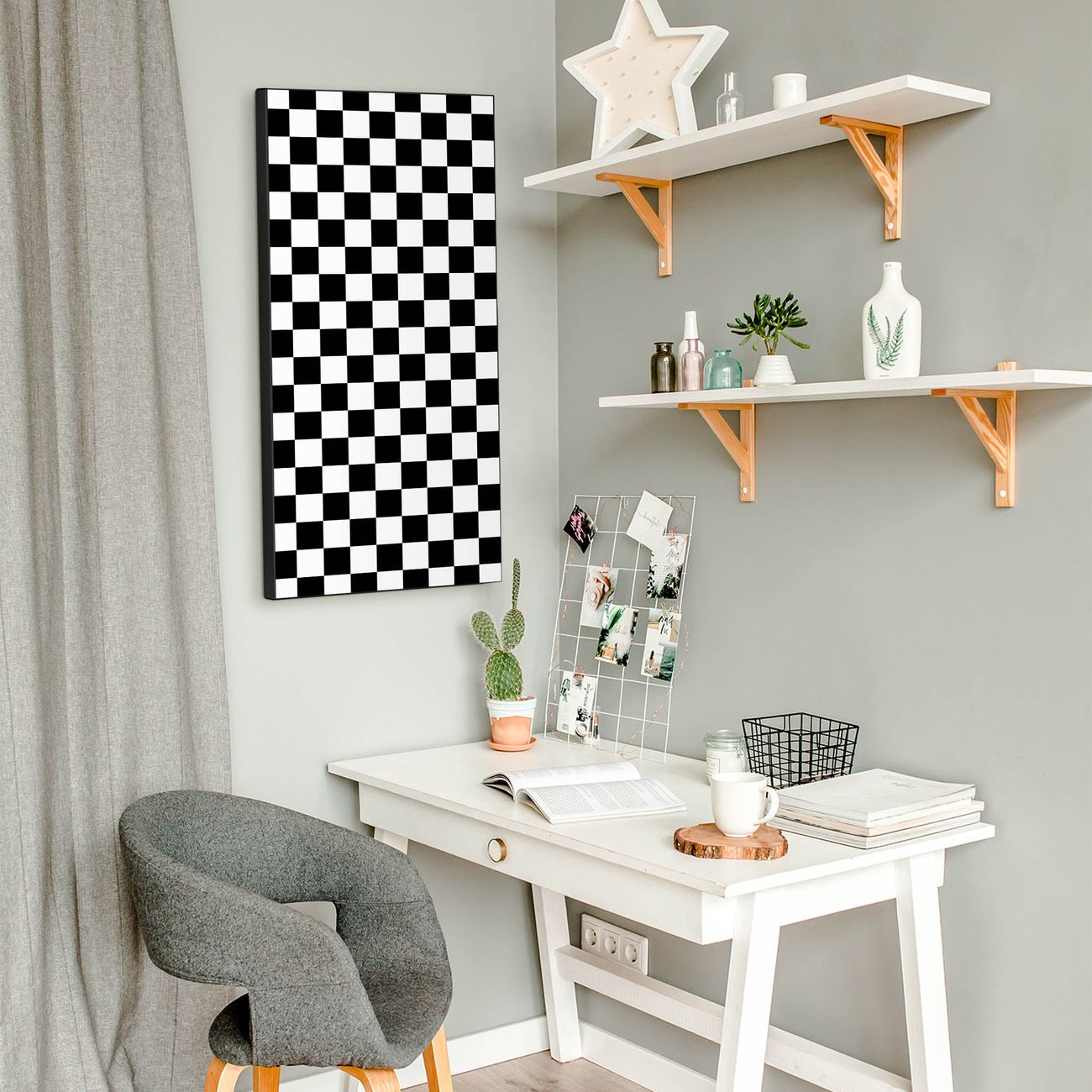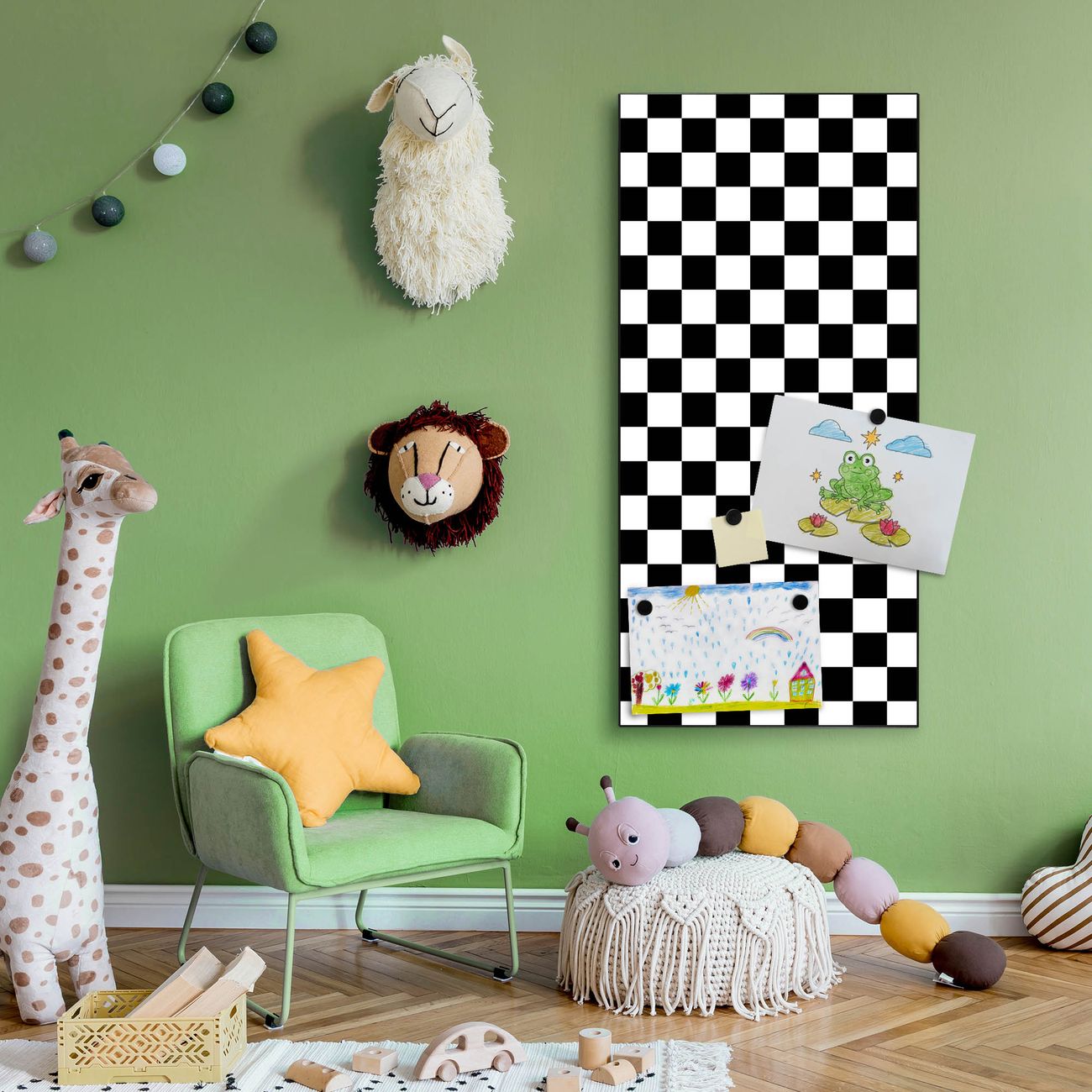 FUNKTION:  Die banjado Magnettafel mit Motiv Karo Schwarz Motiv bringt Ordnung in Ihr Zettelchaos. Fotos, Termine, Notizen oder Rezepte lassen Sich hier stilvoll mit Magneten ordnen, Sie behalten alles im Blick. An der Design Magnettafel halten alle handesüblichen Magnete. DESIGN:  Die magnetische Pinnwand mit dem Motiv Motiv Karo Schwarz ist ein eleganter Begleiter im Alltag. Mit dieser Memotafel aus Metall haben Sie auch ohne Notizen und Magnete ein schönes Dekoelement. Das Format bietet Ihnen ausreichend Platz um alle wichtigen Informationen im Blick zu behalten. DETAILS:  Die Magnettafel besteht aus silber-grau, weiß oder schwarzlackiertem Stahl. Sie hat eine Größe von 37 x 78 x 2cm. Es befinden sich auf der Rückseite vorgefertigte Aufhängungen die eine schnelle und unkomplizierte Anbringung ermöglichen. Das Motiv ist mit einem seidenmatten Laminat versehen und schützt so zusätzlich vor Kratzern. NUTZEN:  Sie können dieses Memoboard groß als Wandbild nutzen, es halten alle handelsüblichen Magneten daran. Die Pinnwand ist mit einem feuchten Lappen oder Schwamm abwischbar. Sie finden bei uns eine große Auswahl an passenden Magneten. BANJADO:  Wir sind ein kleines Team aus dem Herzen von Sachsen. Wir fertigen alle Artikel von Hand für Sie an, Sie erhalten keine preiswerte Importware. Auf Wunsch können Sie auch Ihr eigenes Foto auf die Magnettafel aufbringen, schreiben Sie uns an. Herzlichst, Ihr banjado-Team